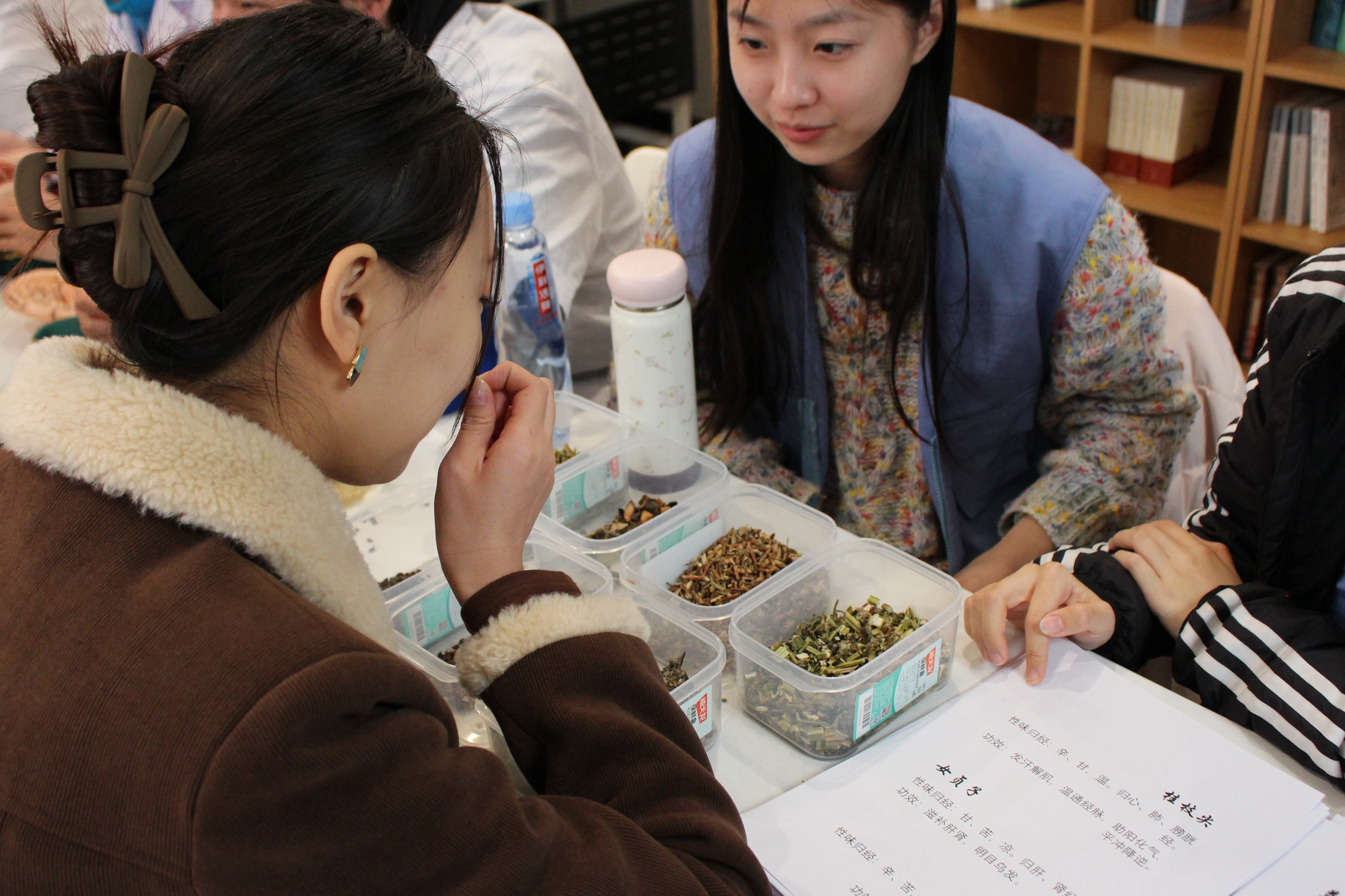 闻香识药环节现场陈列多种中草药,同学们积极参与辨识竞猜,在趣味互动中加深对草本文化的认识。