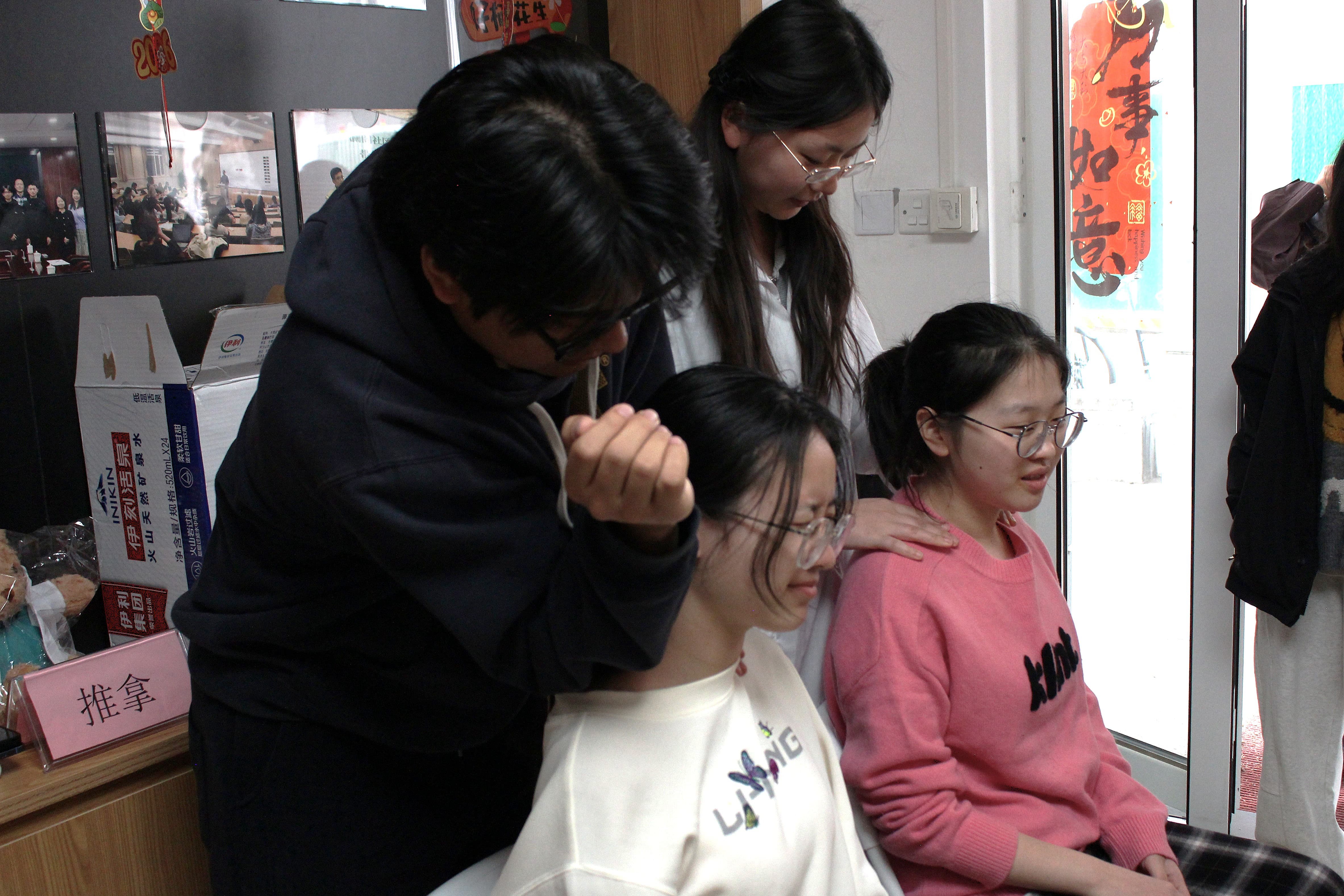 推拿区志愿者运用专业手法,为同学们提供推拿肩颈,帮助缓解久坐带来的疲劳,受到同学们一致好评。