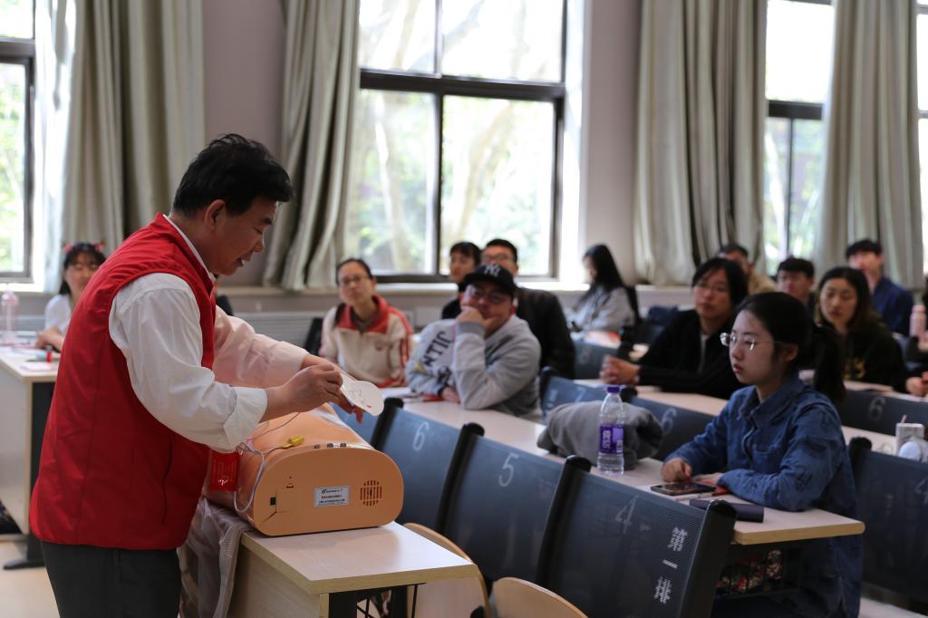上午8时30分,活动正式开始,本次活动由海淀区红十字会崔世宝老师主讲。崔老师首先为大家介绍了红十字会的有关知识,诸如红会组织的性质,起源和根本原则等。随后便进入急救培训的主要内容,崔老师介绍了抢救生命的绿色通道“生命链”,并针对“生命链”的每一个步骤做详细讲解。建立绿色通道“生命链”第一步是心脏除颤。崔世宝老师简单介绍了心脏除颤仪的用法,利用道具向同学们展示操作方法,使同学们更加直观地认识心脏除颤仪的使用方法;接下来,崔老师带大家学习胸外按压,首先让同学们起立,跟随老师鼓掌的频率在桌上模拟按压,使同学们了解胸外按压的有效频率。