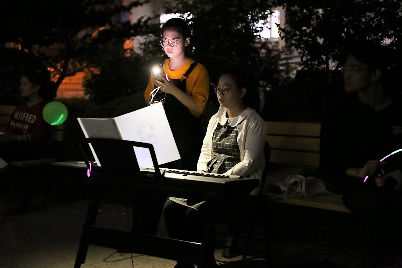 余音绕梁,人群久久不散,同学们纷纷聚集在宿舍楼下拍照留念。红会工作人员将荧光笔分发给参加活动的同学们,大家挥舞着五彩缤纷的荧光棒,现场一片欢声笑语。