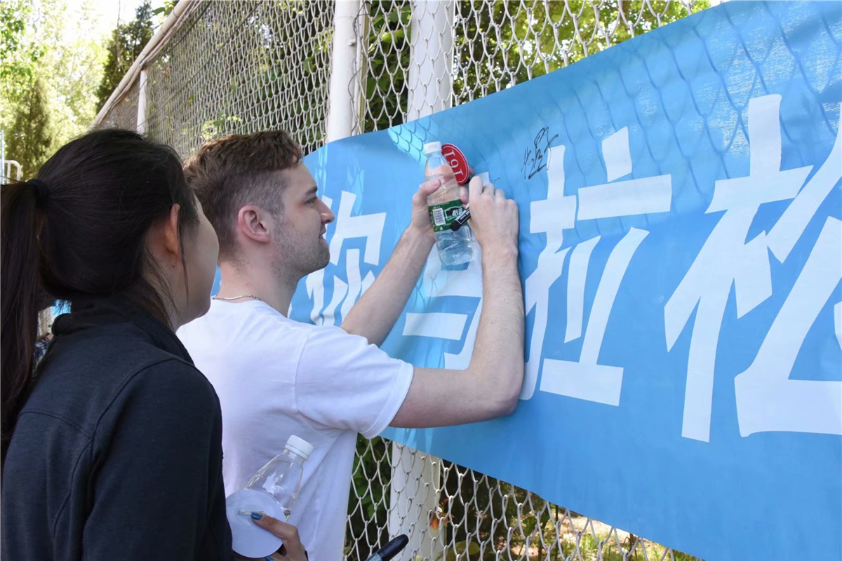 参赛者陆续到场检录并在横幅上签名留念,在北语田径队队员罗仁松的带领下进行赛前热身运动。
