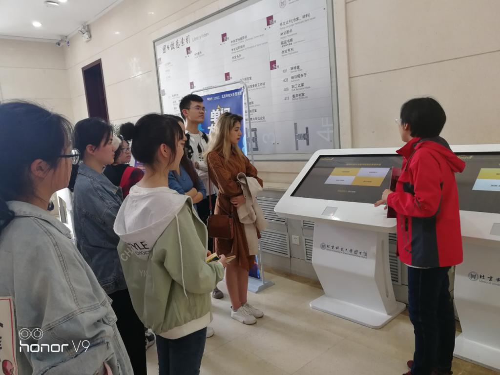 北京科技大学图书馆的姜老师、兰老师热情接待北语师生一行,并带领同学们参观学习北科大图书馆。