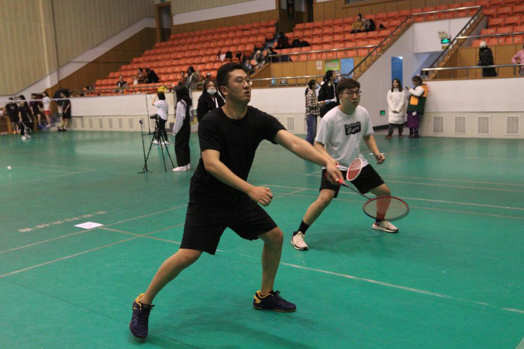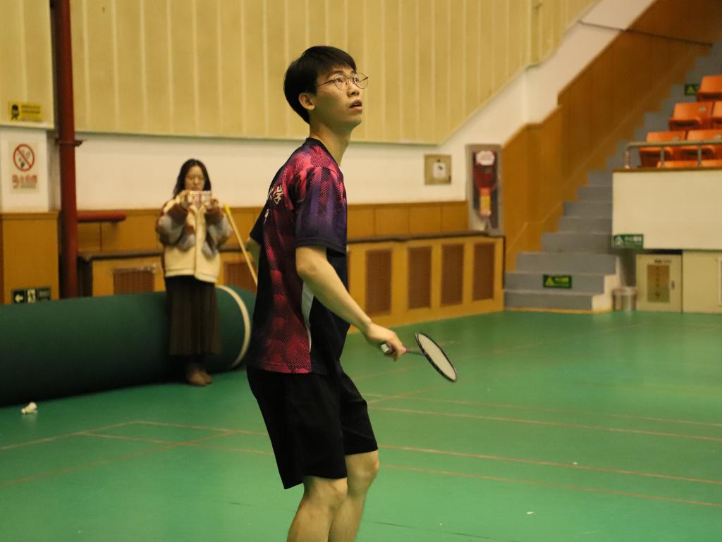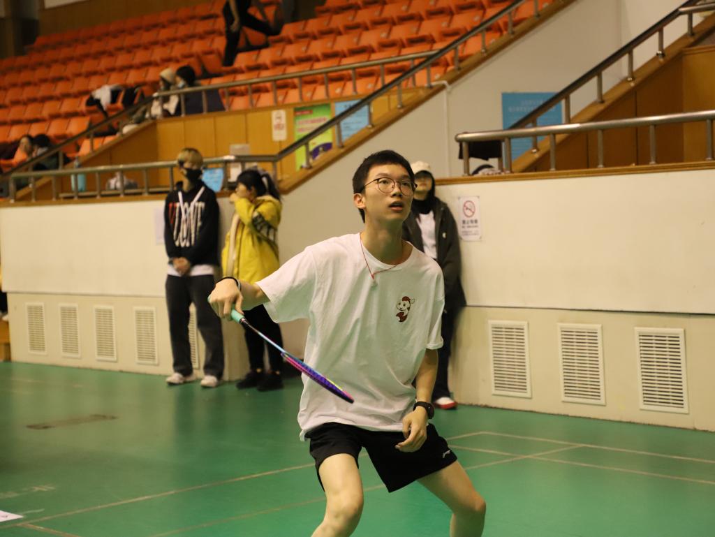 比赛全程采用淘汰赛制,比赛规则为女单、女双一局21分,男单、男双、混双一局31分,一局定胜负。比赛正式开始前,选手们开始调整备赛状态,紧张地进行赛前热身和练习,羽毛球飞梭的声音不绝于耳,为即将开始的比赛做好准备。老生男单比赛中,选手杨珉轩跑动灵活,往前轻推,勾放搓,游刃有余,紧密地关注着球的运动方向,最后以一绝妙扣杀拿下冠军。新生男单比赛同样精彩,黄睿赢下最终一局。