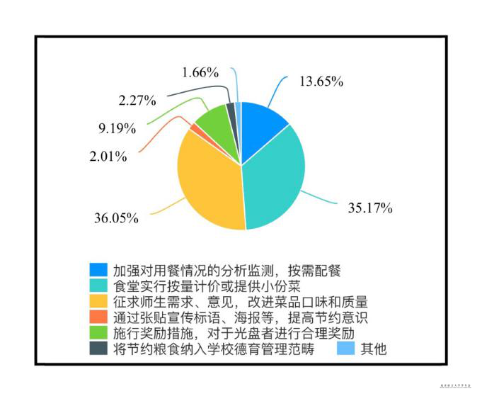 如图所示,同学们认为,可以通过征求师生需求、意见,改进菜品口味与质量;食堂实行按量计价或提供小份菜等方式来节约粮食。我们会积极听取同学们的意见,进一步调查剩余饭菜的种类和原因,及时与食堂等有关部门进行协商,按照大家的需求做出调整,以便于同学们能够更好地节约粮食,同时也能更好地制止餐饮浪费行为。