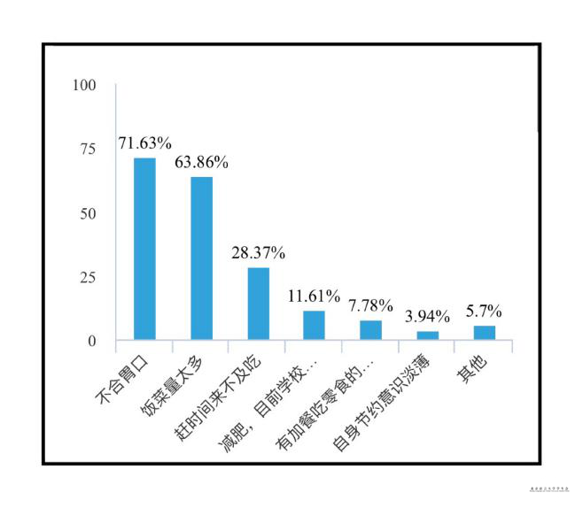 从图中我们可以看出,大多数同学由于饭菜不合胃口、量太多等原因没有做到光盘。通过问卷我们已经了解了同学们的需求,之后,我们会听取大家的意见,进一步了解同学们的用餐需求,与食堂管理人员进行协商,调整菜量和口味,及时解决问题,更好地践行节约粮食。