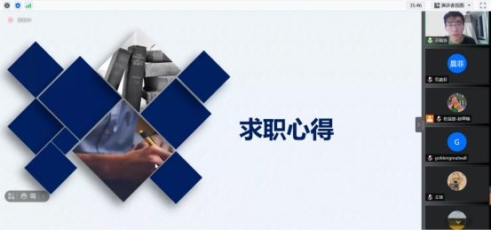 分享会通过腾讯视频直播的方式,邀请了袁广慕、王晓羽和徐维三位优秀的学长学姐分享自己的求职经验,直播实时观看人数突破100人次。分享会包括学长学姐发言、同学提问、一对一答疑等环节,同学们踊跃参与,积极提问,形成了融洽的分享氛围。