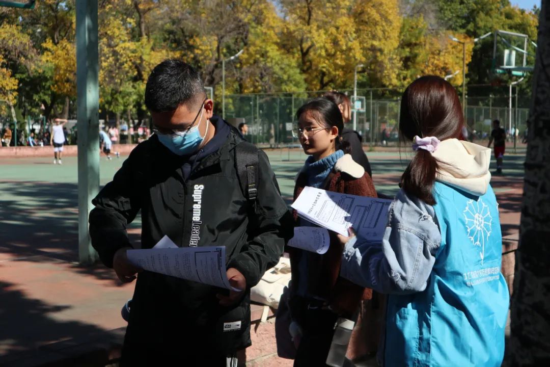 12:05,身着蓝色马甲的志愿者们在篮球场南侧集结并开始领取任务。随后,志愿者们在篮球场南侧的主道两旁分散开来,向来往的同学积极宣传志愿北京实名注册的相关事宜。针对同学们第一次接触志愿北京平台可能存在的一些困惑,例如注册这个平台的意义、注册时的操作问题等,志愿者们在宣传单上做出了相应的回答,并现场解答大家的疑问,增进了同学们对志愿北京实名注册工作的认识。