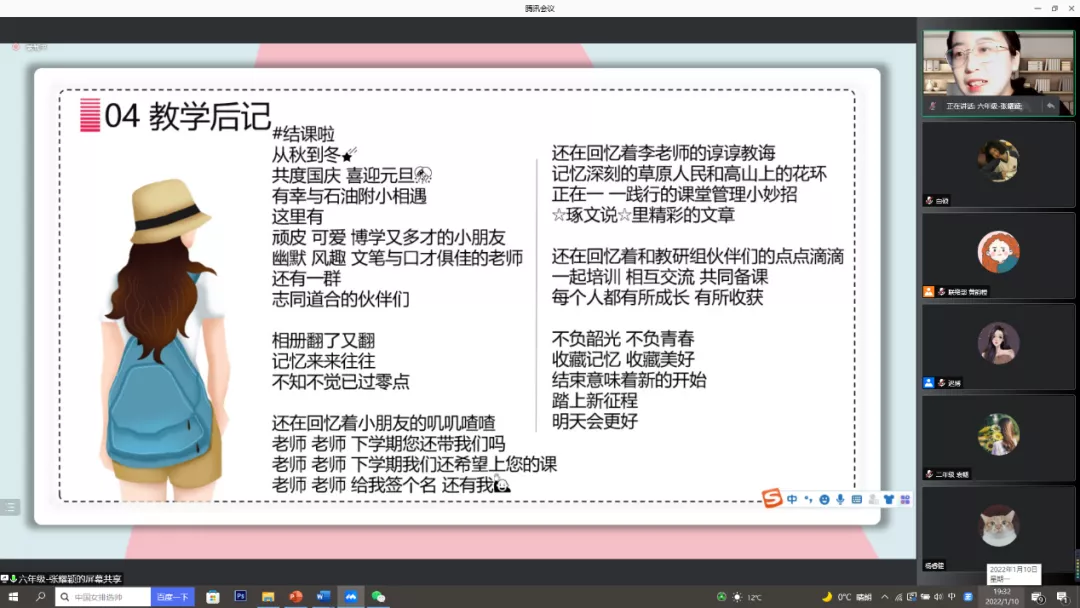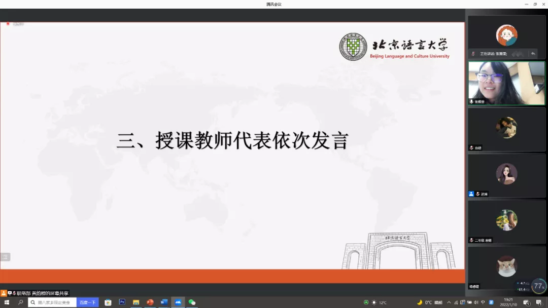 实习教师代表进行了精彩的经验交流与感悟分享。石油附中实习教师王静同学表示,虽然在授课过程中存在着困难,但是每位实习教师都在谨慎备课,努力呈现出更优质的课堂。感谢在实习过程中所有帮助过她的人,很高兴通过这个平台,让她迈出了成为教师的第一步。一零一实验学校实习教师张雅雯同学表示,在教学过程中,不仅为同学们带去了西语和法语知识,也向同学们带去了法语和西语文化。当然在教学过程中也存在很多问题,而各位实习教师正是在不断解决问题的过程中提高了各方面的能力。石油附小实习教师张耀颖同学从教学概况,教学体会,团队建设和教学后记四个方面进行了分享。她表示,经过一学期的教学,我们不仅为学生们传授了知识,还带给了他们独特的记忆。我们没有辜负这一段时光,那里的学生们也为我们带来了欢乐和能力的提升,非常感谢这一段经历。