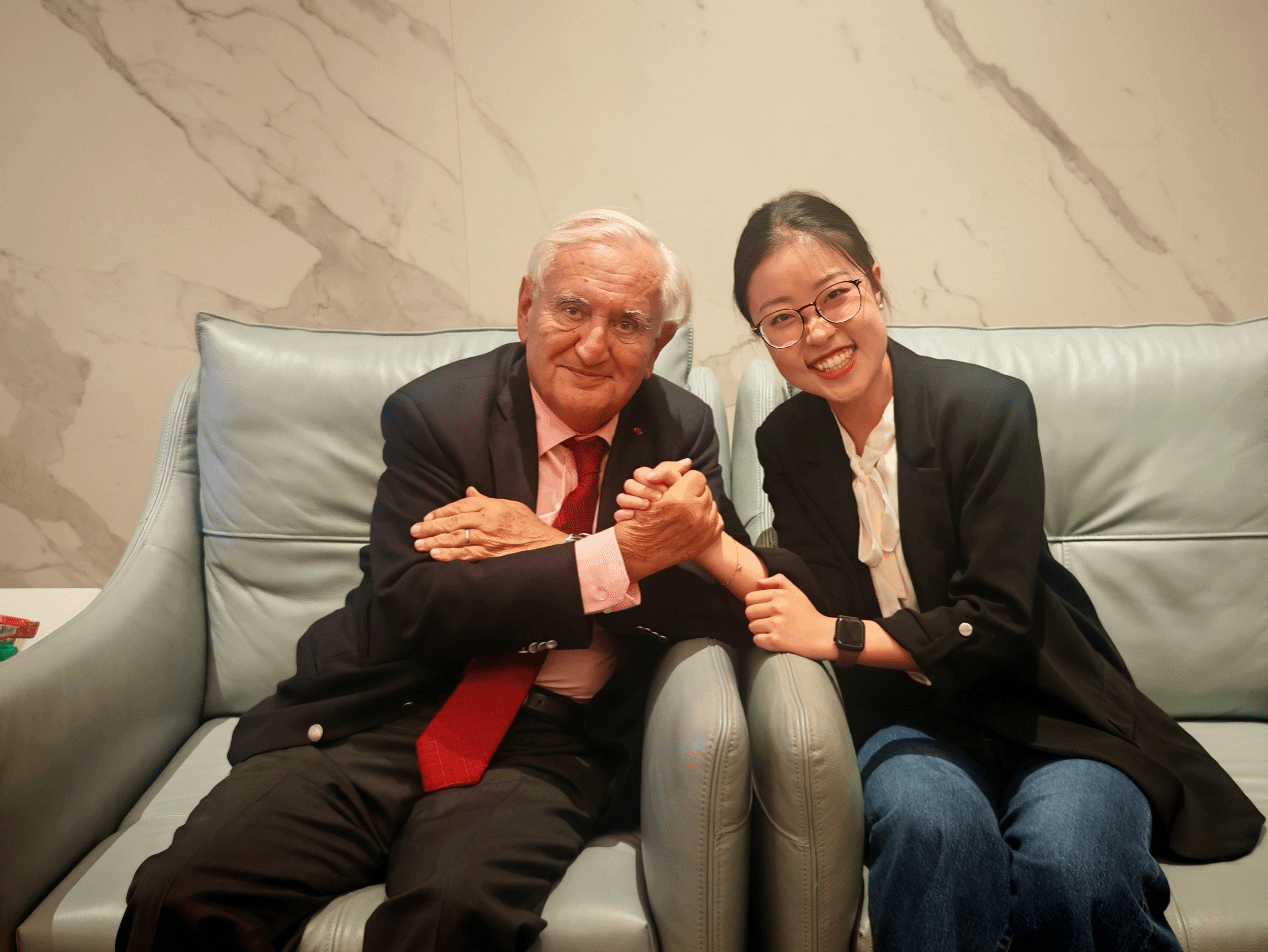 图为王馨梅同学与法国前总理拉法兰先生的合影