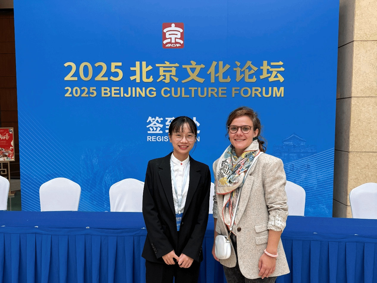 23级法语口译王馨梅同学负责法国前总理拉法兰先生以及前法国国家教育部与青年部副部长佩雷斯女士(Emmanuelle Peres)的陪同口译工作。她主要负责接送机工作,协助联系活动主办方,确认外宾在京期间的活动日程,并做好与各方的沟通对接。活动期间,她以“一对一”形式全程陪同,保障了随行交流的顺畅与日程执行的有序。通过这些具体而细致的工作,她不仅积累了宝贵的外事实践经验,并对大型国际文化交流活动有了更直观的认识。王馨梅同学表示,此次实践让她更加深刻地体会到口译工作中既要具备扎实的语言功底,也需要细致的组织协调与跨文化沟通能力。能够直接参与到中法高层人文交流的现场,她感到十分荣幸,同时也意识到作为青年学子肩负的使命与责任。