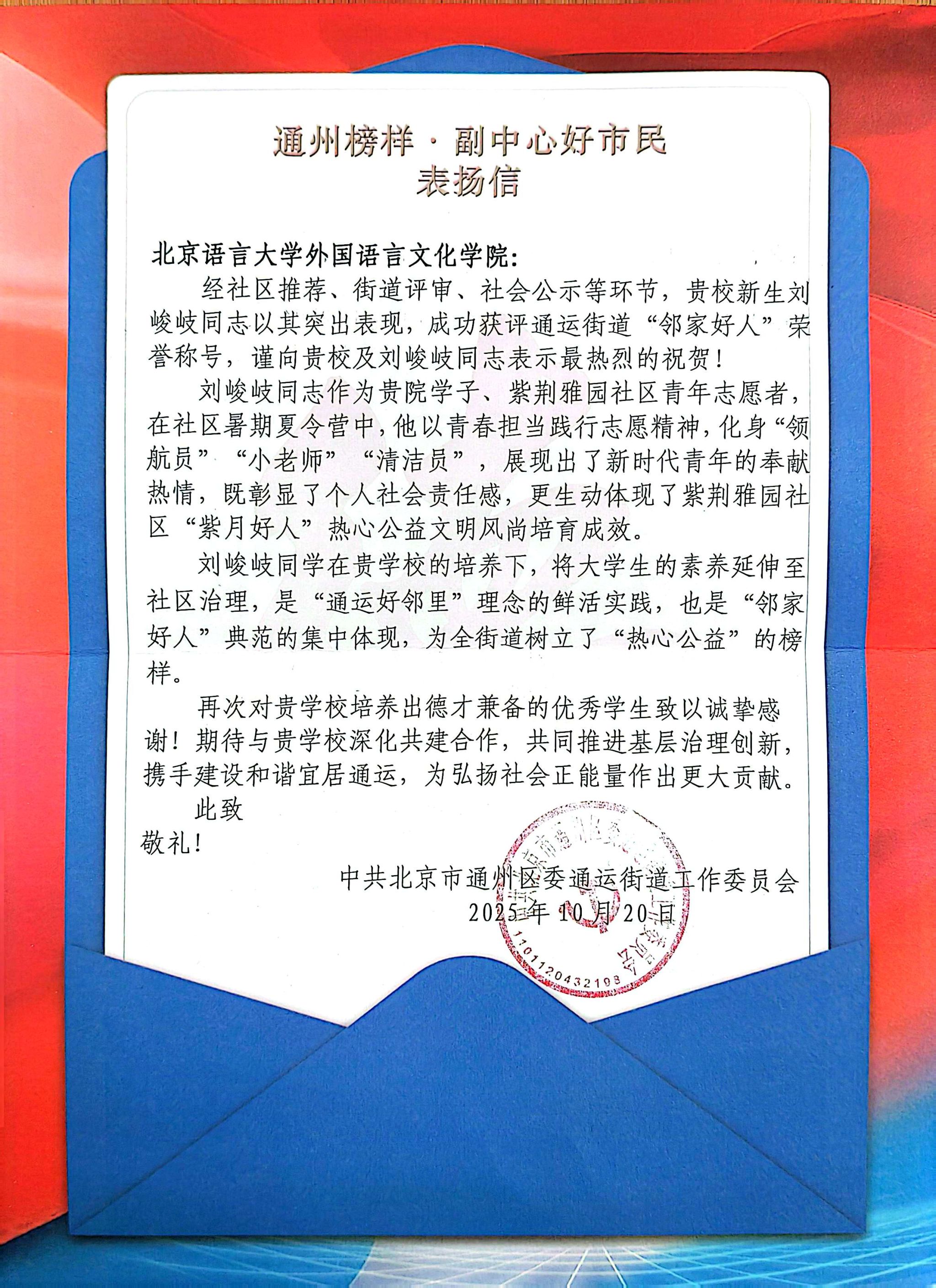 北语新闻网11月27日电(通讯员 耿思贤)近日,外国语言文化学院收到一封来自通州区的特别表扬信,信中对2025级德语(涉外林业工程人才实验班)刘峻岐同学予以通报表扬,并授予其“通州榜样·副中心好市民”荣誉称号。这份荣誉,将他在紫荆雅园社区暑期夏令营中温暖人心的志愿服务故事,再次带回到我们眼前。