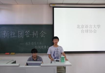 9月14日15时,北京语言大学社团理事会在教二楼406教室召开了新社团的答辩会。出席答辩会的有团委老师刘新宇、社团理事会主席团及相关部长、有意愿注册新社团的社团负责人和协助人员。