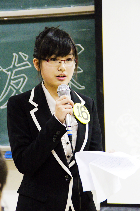 参赛选手被分为两组,每组8人。分别被要求进行为时3分钟的定题演讲“Culture Diversity vs. Culture Integration”和1分30秒的即兴演讲,并回答评委老师根据讲题或个人观点提出的问题。定题演讲环节,选手们纷纷提出了自己的见解,视角独特,例证丰富。既谈到了历史上文化独特或多元的现象,又涵盖了时下热门的科技文化传播现象。相比之下,即兴演讲的话题涉及领域更加宽泛。“你如何看待大学生抽烟以缓解压力的现象?”“如果你有幸作为中国学生代表见到了美国总统奥巴马,你会说什么或送他什么礼物?”选手们的回答条理清晰,妙语连珠,博得了全场阵阵掌声。