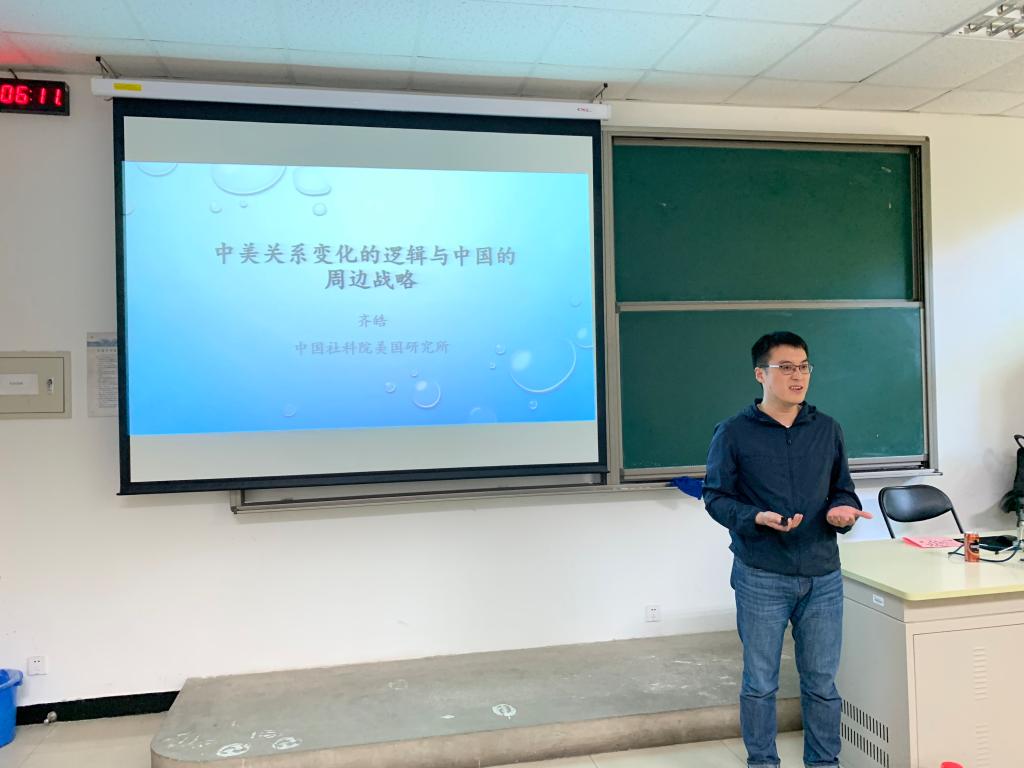 5月20日下午,中国社会科学院美国研究所齐皓博士莅临“当代中国对外关系”课堂,为我校国际关系学院大一学生做了题为“中美关系变化的逻辑与中国的周边战略”的精彩讲座。