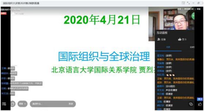 4月21日下午,北京语言大学国际关系学院院长、联合国研究中心主任贾烈英教授走进直播间,为北京第二外国语学院政党外交学院的同学们做题为“国际组织与全球治理”的直播讲座,政党外交学院近百名同学在钉钉直播间观看直播并参与现场互动。这是二外2020年第2期“国际组织大讲堂”,宋文龙老师主持并参与了直播讲座。