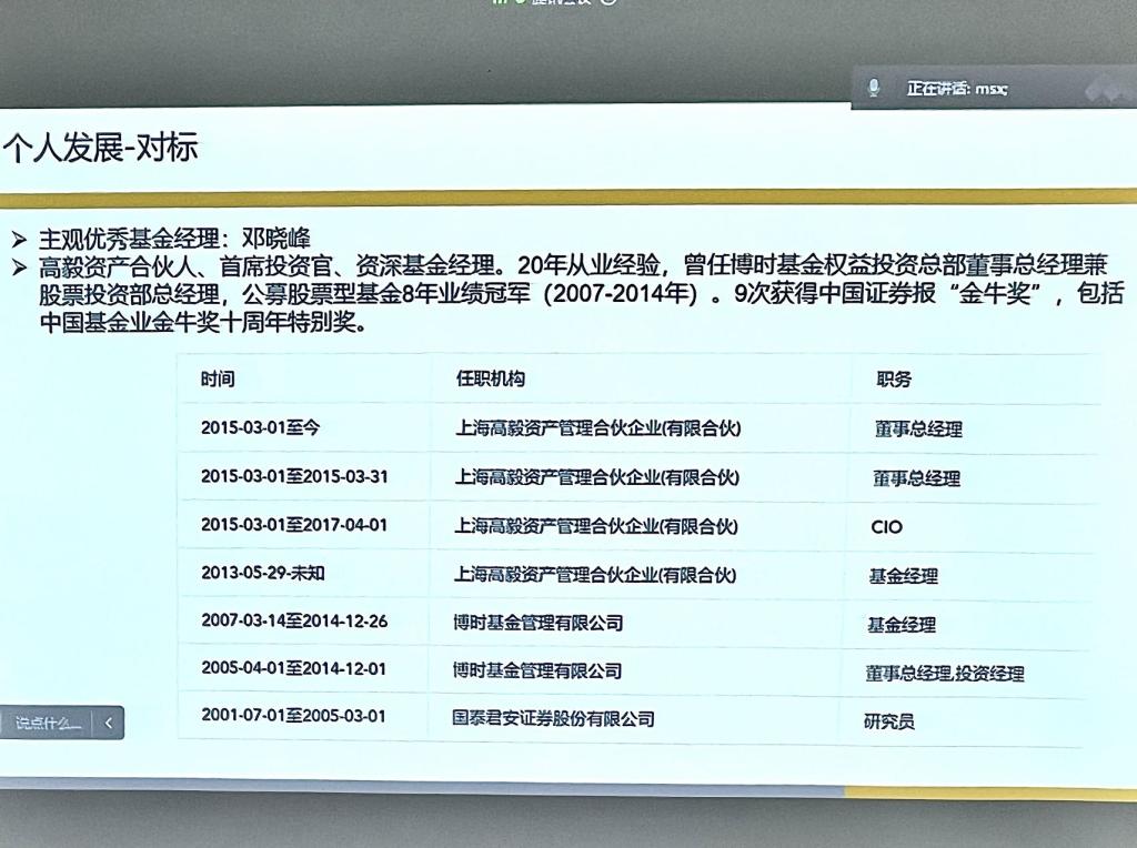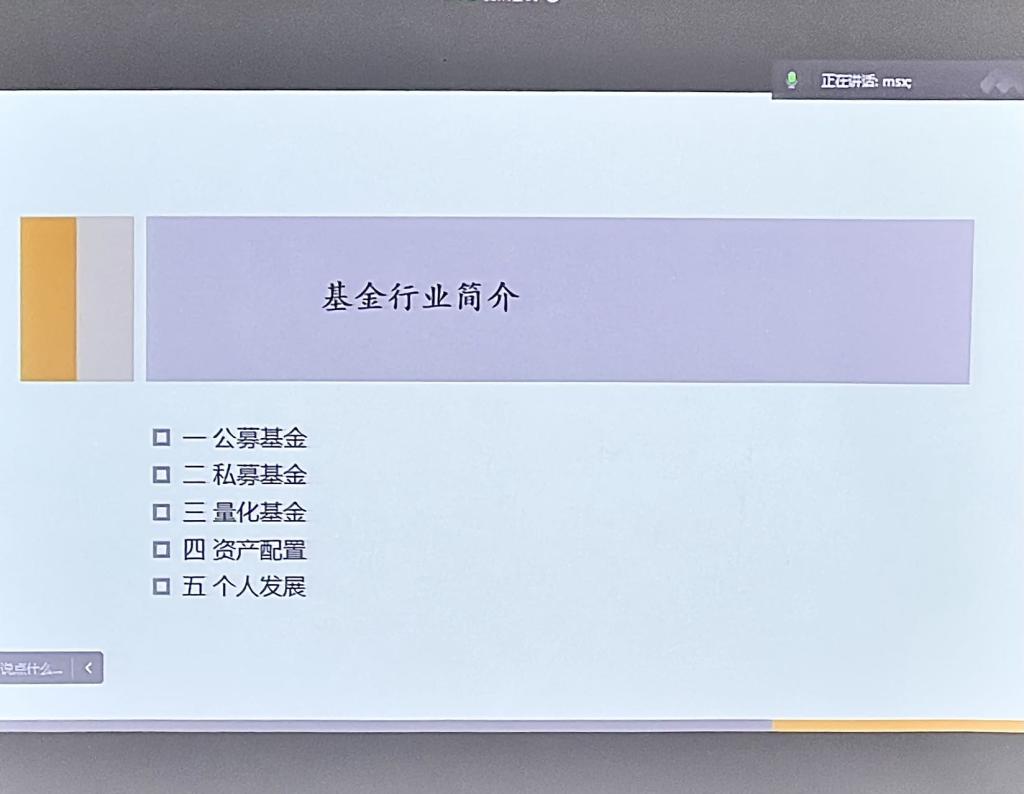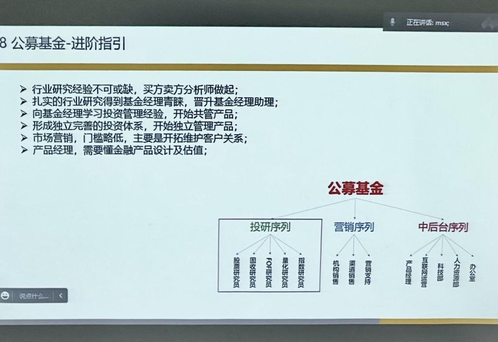 曹棋老师首先介绍了基金行业的基本情况。在资产管理行业中,除了各大金融行业中的资管计划和养老基金以外,按组织架构可以分成公募基金、私募基金两类,按金融产品可以分成策略类和资产类,按发展路径可以分为量化基金和资产配置。随后,曹棋老师指出,公募基金和私募基金是资管行业中两个重要的参与者,曹棋老师通过具体行业内公司的案例,对公募和私募基金的行业特征、组织架构、规模、人才培养、知识需求以及业界专家等各方面进行了详细的介绍。紧接着,曹棋老师进一步讲解了量化基金和资产配置业务的特点、工具手段、绩优公司、知识储备,结合对同学们个人发展的建议,强调在从业之时要有较为清晰的职业路径规划,建立适合的知识体系框架和知识储备。