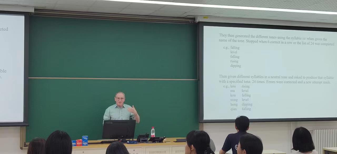 Taft教授的报告内容主要分为两部分:第一部分:通过多个言语产生和语音判断实验,Taft教授介绍了“声调的心理表征”。第二部分:Taft教授介绍了汉语二语教学中的声调学习,并分享了他自创的TAFT系统,即用字母代表调号,如Yihng, Yiwng, Yiyng,分别对应二声、三声和四声。教授的后续研究表明,对于汉语二语习得者来说,TAFT系统更有助于他们记忆声调。