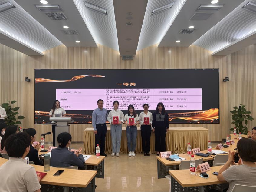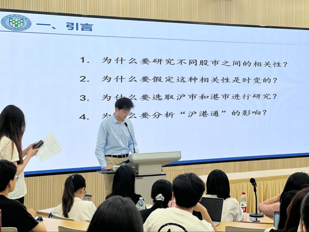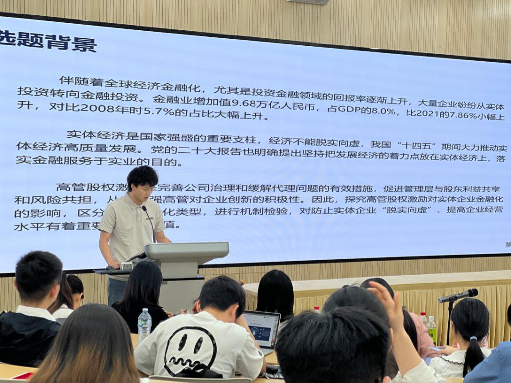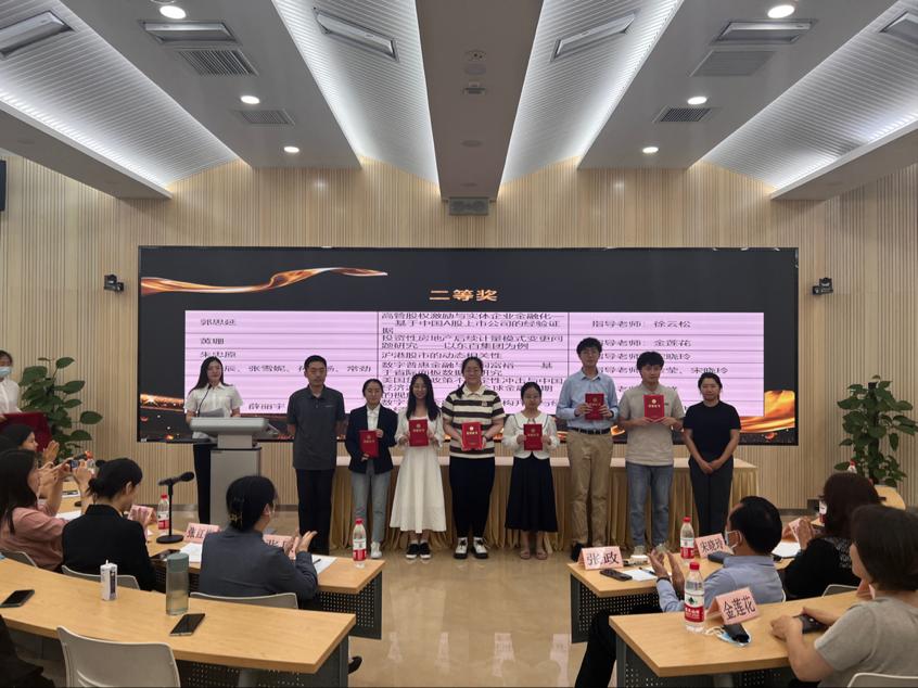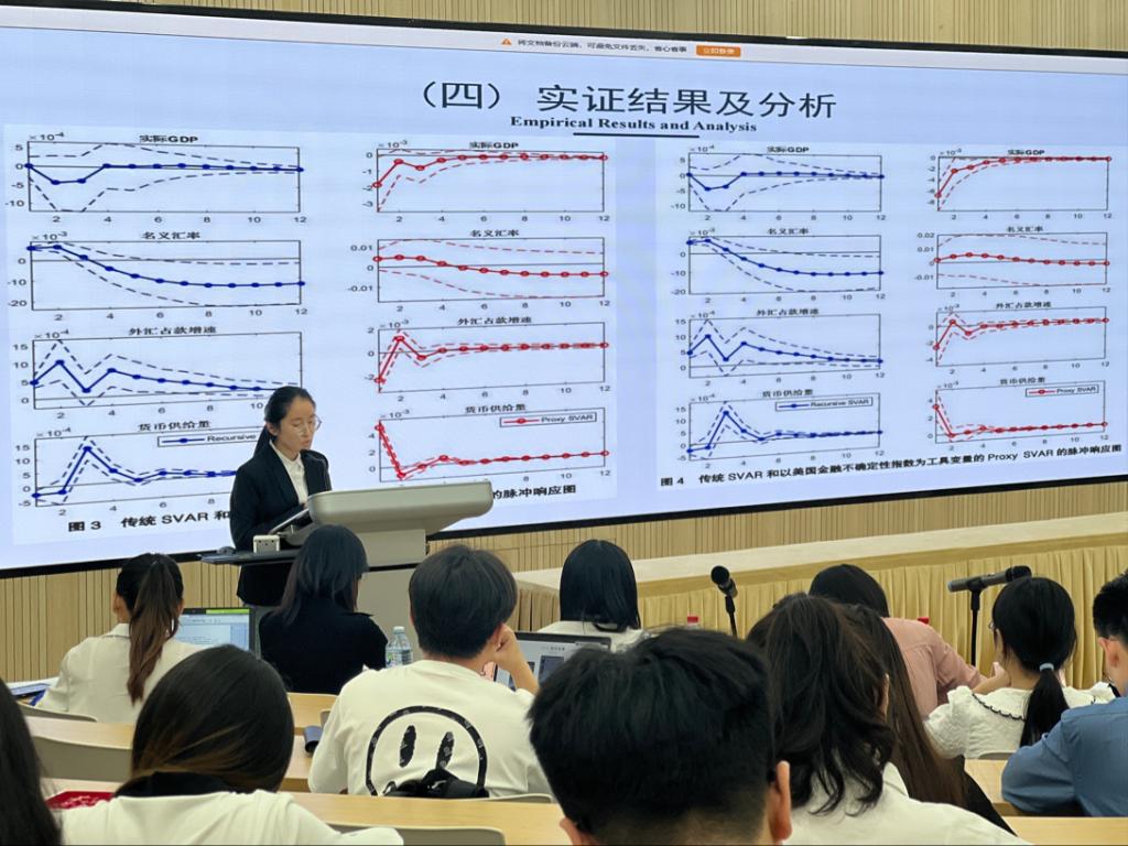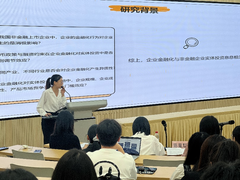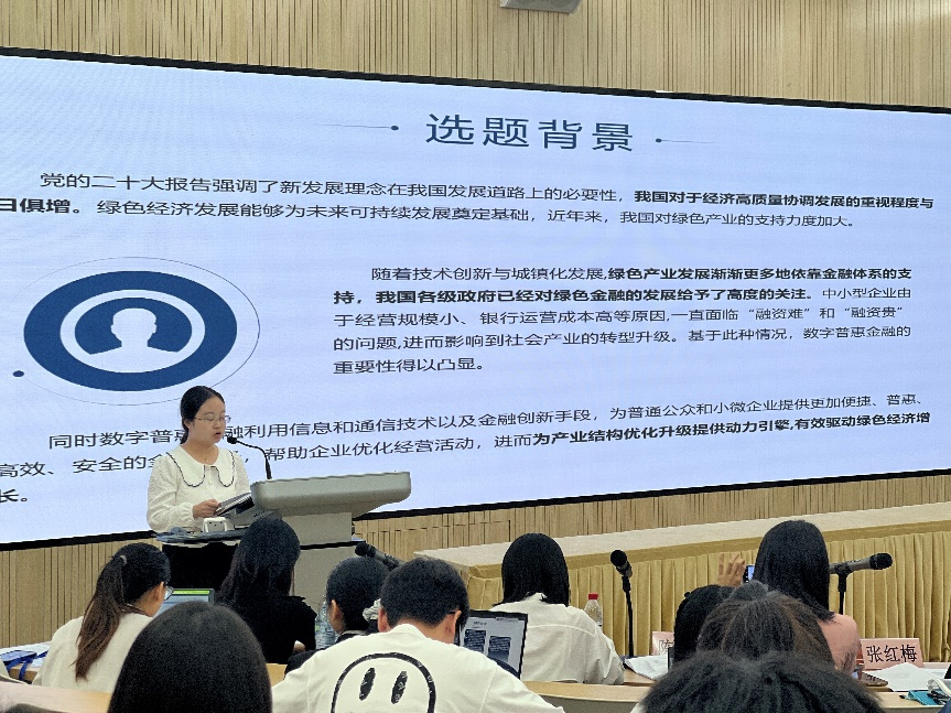 本次论坛的第二个环节是学生汇报展示。进行汇报展示的学生代表选题新颖,论证严密,聚焦学术热点,涉及到“数字普惠金融、产业结构升级与绿色经济发展”、“企业金融化是否降低了实体投资”、“沪港股市的动态相关性”、“美国货币政策不确定性冲击与中国经济波动”、“高管股权激励与实体企业金融化”等话题,论述详实,结构清晰,充分体现了我院学生的学术创新能力。汇报展示后,评审老师从研究思路、论证方法、学术价值等多方面分别对学生汇报进行点评,并提出了进一步的论文修改和深入研究建议。
