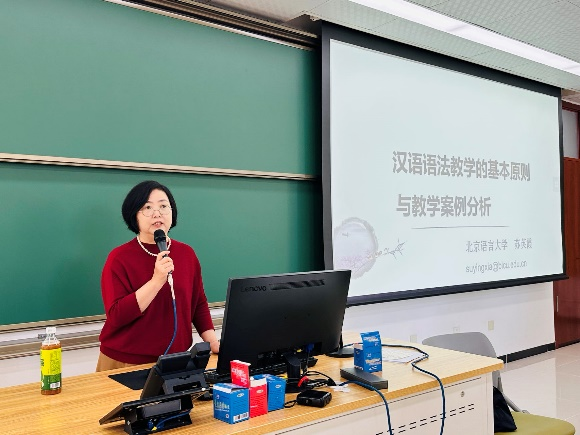 10月25日下午,“汉语第二语言教学系列专题”第五讲在教二楼430教室如期开讲。应用中文学院院长苏英霞教授为同学们带来了题为“汉语语法教学的基本原则与教学案例分析”的专题讲座。苏英霞教授讲解了汉语语法教学的九大原则,并结合丰富的教学以及培训案例,为同学们现场演绎语法教学方法及技巧,引导同学们挖掘失误案例的原因,探索更有效的教学方法。讲座现场座无虚席,气氛热烈,同学们收获了宝贵的理论知识和实践经验。