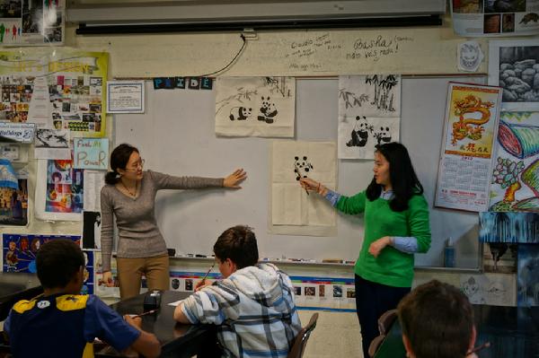 孔院志愿者曾竣和龙吟正在演示如何画水墨熊猫