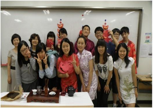 为使韩国外语高中学生更好地了解各国文化,大邱教育厅从各高中选拔外语英才学生组成大邱市高中外语英才学生团进行文化体验活动。2012年9月13日,我院接待了第一批英才团学生,为他们举办了一场别开生面的中华文化体验活动。活动由启明大学孔子学院中方院长与全体中方教师和韩方工作人员共同策划和组织。针对这批学生的特点,活动采取了语言实践与文化体验相结合的方式,在两个小时的时间里,安排了参观、讲座、茶艺欣赏、剪纸体验、中国传统服饰展示等环节,使学生们在充满浓郁的中华文化气氛中,边“说”、边“学”、边“动”,现场气氛十分活跃,活动效果受到带队教师的高度评价,并希望能向更多的学校和老师宣传和推荐。