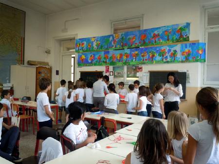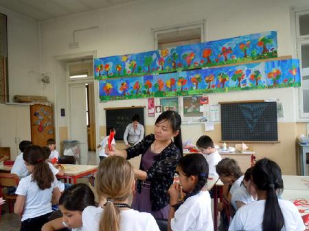 2012年6月8号上午,米兰圣心大学孔子学院的志愿者席莉和朱圆老师来到米兰A.Diaz小学给孩子们做剪纸和中国结文化体验活动。该小学是米兰市第一所开设中文课程的小学。学习中文的小孩多达80余个。