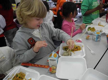 中午,学校特别为孩子们准备了饺子作为午餐,并且给每人发了一双筷子。孩子们执着而努力地使用筷子的表情,让我们看到了他们学好中文的信心。