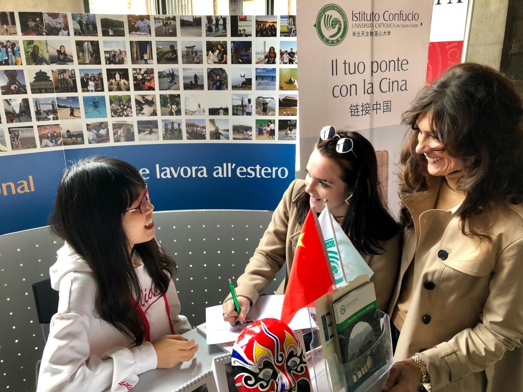 此次活动主要面向圣心大学布雷西亚校区的本科生,以及想要报考圣心大学布雷西亚校区的高中生。虽然是周六,天气也不尽人意,但依旧有很多学生前来咨询感兴趣的专业和课程。我们孔院的展台也吸引了很多对汉语和中国文化感兴趣的学生。