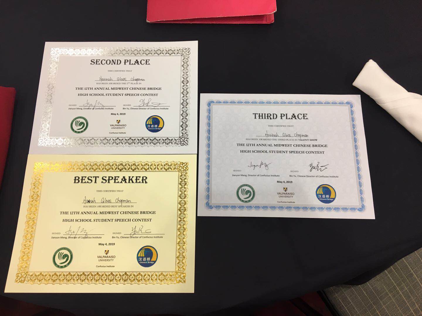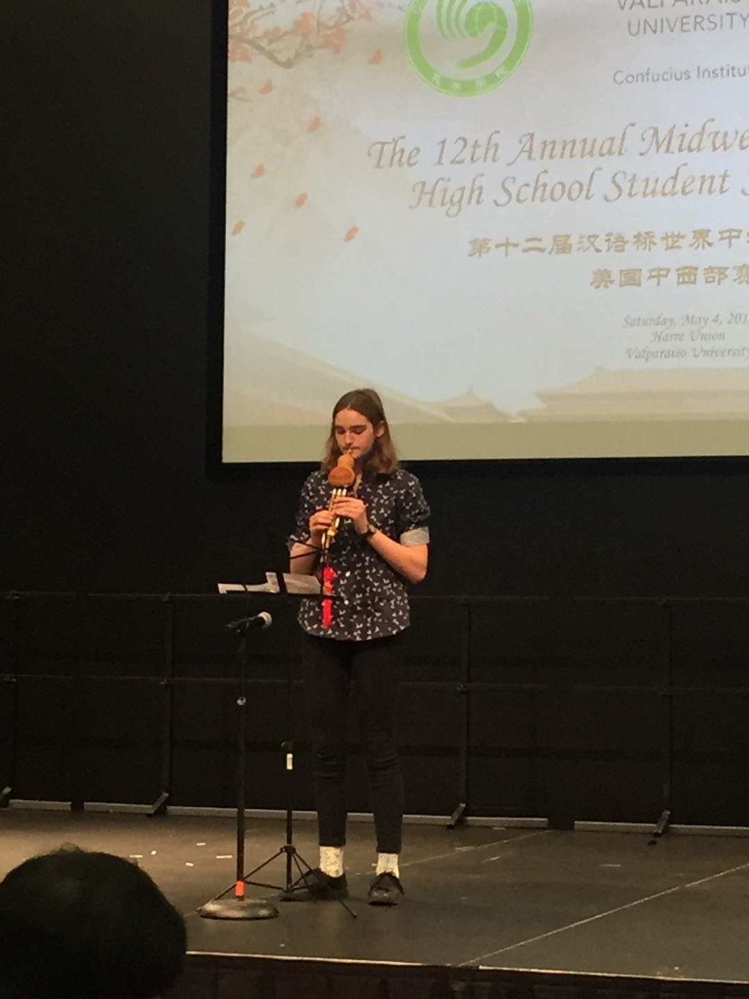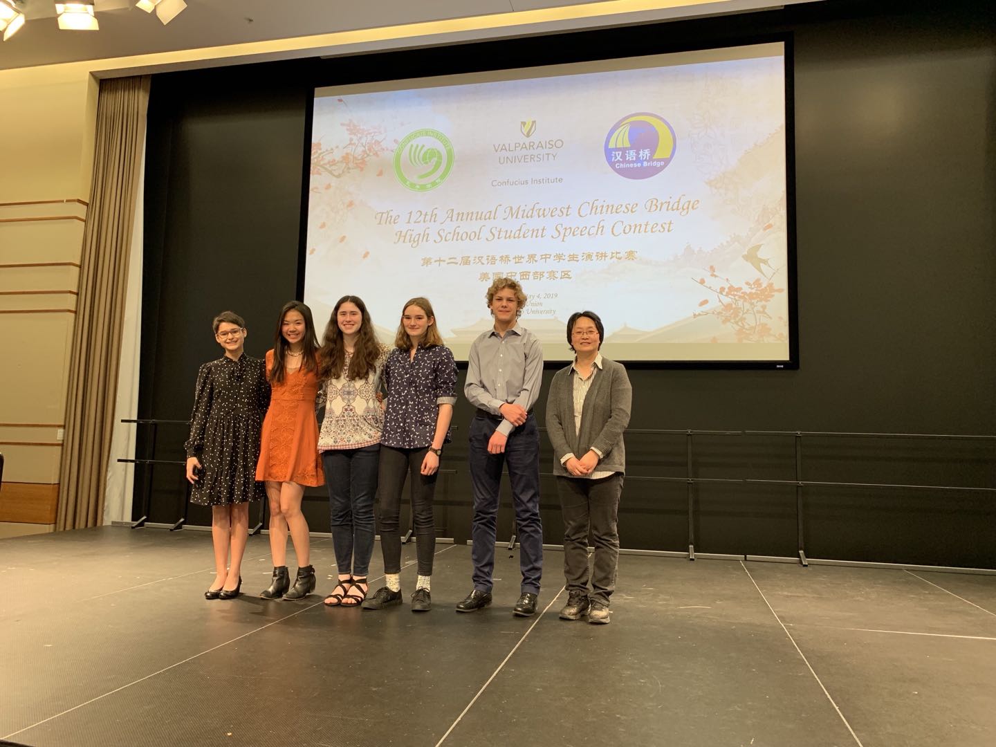 当地时间5月4日,第十二届汉语桥世界中学生演讲比赛(美国中西部赛区)在瓦尔帕莱索大学举行。由西密歇根大学孔子学院选派的八名学生参加了本次比赛。他们分别是来自卡城中文学校的Aurora Burton(安若娜)、卡拉马祖中部高中的Hannah Glass Chapman(宁春菊)、Loy Norrix高中的Anayely Esmeralda Martinez-Equia(马若梅);来自林丘北部高中的Averie Fitzjohn(艾维)、William Rechner(小威)、Miriam Chrenka(咪咪)、Catherine Hwang(凯丽)和Josephine Koch(柯林溪)。