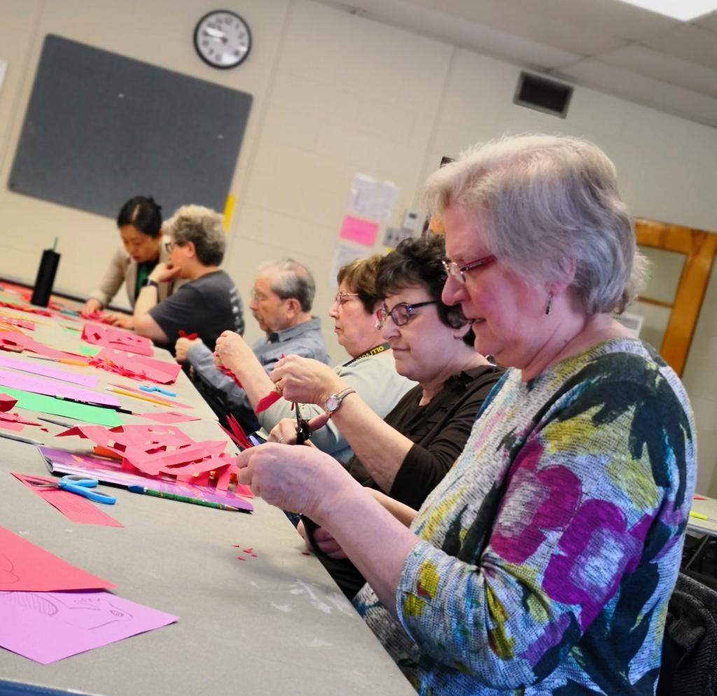 4月10日上午,孔院教师们又将中国剪纸带到了奥舍尔。剪纸作为一种民间传统艺术,形式多样、简单易学。从充满节日氛围的灯笼到象征美好婚姻的“囍”、应景的立体“春”字、常见的“福”字,最后是十二生肖中的猪,以及深受所有人喜爱的熊猫。不但能让学员体验到简单的剪纸技巧,也能由此了解其中蕴含的中国文化。听到“囍”字常常用作结婚祝福,卡门(Carmen)开玩笑说:“那‘喜’是不是代表离婚?”——引来全场哄然大笑。每完成一个作品,大家都开心地一起合影留念。课程结束后,有学生特意询问有没有电子版剪纸图样,想要回家教孙子孙女做中国剪纸。还有很多人积极上前了解下次讲座的内容。