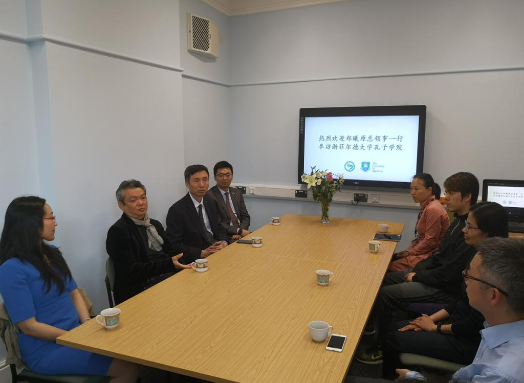 郑总领事一行还到访谢菲尔德大学孔子学院,慰问了谢菲尔德大学孔院全体教师。总领事与大家亲切交谈,详细询问孔院教师及志愿者们的工作和生活情况,指出大家是第一线的民间大使,是英国民众认识中国的最直接窗口。通过语言学习,直接传递着两国民众之间的友谊,为未来两国关系的发展铺垫着文化的基础,大家的工作虽辛苦,但润物于民心,彰显使命之光荣、价值之体现,总领馆也将积极配合各方,携手共促发展。