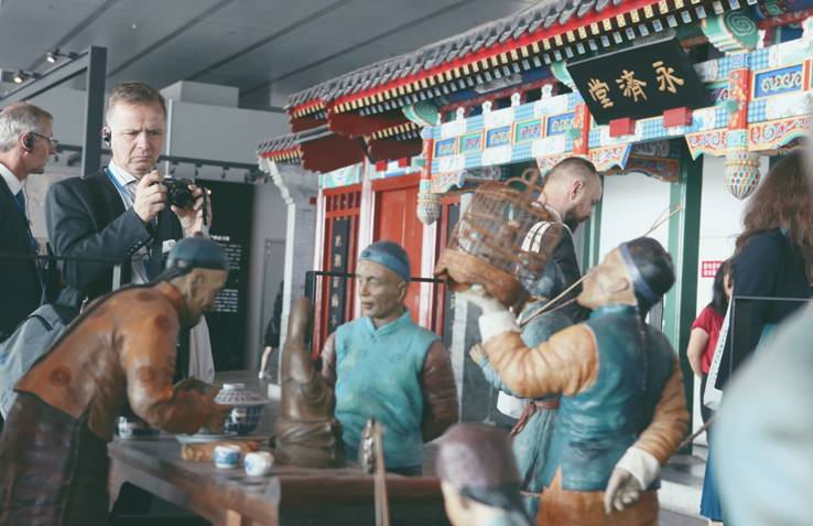 首都博物馆原馆址是“北京孔庙”,以展示北京五十万年人居史、三千年城市史、八百年京都史及其无比丰厚的文化遗存为主业,集收藏、整理、修复、研究、展览、公共教育于一身,肩负保管北京地区的历史文化遗产的重任,同时也是新北京与世界进行文化交流的一个重要场所,是隶属北京市政府的大型综合类博物馆。此次参观包括两大板块。一是在基本陈设展。内含“古都北京.历史文化篇”和“京城旧事.老北京民俗展”。展览皆以北京文化为主,既以时代演进为顺序,展现了北京从原始聚落形成城市到最后成为人民共和国首都的历史进程,也以民间民俗文化为主线,展示具有北京特色的“胡同人家”中的婚丧嫁娶和衣食住行中的各种习俗和礼仪,全方位的向欧盟来华研修访问团展现了北京纵横发展样貌。他们在工作人员的讲解中了解了北京文化,体验了地道的北京生活。同时,首都博物馆工作人员还带领欧盟研修访问团参观了最新的展览,它们分别是“山宗.水源.路之冲——一带一路中的青海”、“器作.匠心——中国当代陶瓷艺术展”、“园说——北京古典名园文物展”、“望郡吉安”。在“山宗.水源.路之冲——一带一路中的青海”展览中,又分为“源远流长”“汉风羌道”“吐谷浑国”“吐蕃东进”“海纳百川”等五个部分,展品彩绘唐卡释迦牟尼天降图、鱼纹彩陶瓮、大角羊纹彩陶罐等,展现了在历史的时间和空间中诞生和成长的青海以及青海文化。“器作.匠心——中国当代陶瓷艺术展”则以“意趣”“空灵”“惟妙”“变幻”为单元主题,向人们诉说了回归自然、回归生活、回归平淡的中国陶瓷之艺,传达了中国特色和传统之美。中国园林以其极具东方之美的特色闻名于世界。北京的皇家园林、坛庙等,与江南水乡带有文人气息的雅致精巧的苏州园林迥异,而独具不同风味。在“园说——北京古典名园文物展”中,下设“地山海 溯自辽金”“坛庙相望 天人合一”“三山五园 移天缩地”“百年公园 旧貌新颜”四个单元,展现了北海公园、北京西北郊的畅春园、圆明园、香山静宜园、天坛、地坛、月坛、社稷坛等著名园林景点,及其在历史变迁中衍生出的中国传统文化。吉安之名寓意“吉泰民安”。吉安位于江西省中部,恢弘的赣江之水穿流而过,孕育了兼具南北特色的文化。这里既有商代新干大洋洲的文明缔造和500年不熄的吉州窑炉火,有至今依旧的白鹭洲书院朗朗读书声,更有井冈山精神的燎原之势与代代相传。在这个展览中,虎耳虎形扁足铜圆鼎、伏鸟双尾铜卧虎、兽面纹铜胄从千年之外款步而来默然不语,青瓷连托烛台、玳瑁斑连托盏、釉下彩绘跃鹿纹盖罐、木雕九龙灯紧随其后承续文明华光。欧盟官员来华研修访问团在讲解员的细致解说下,冲突语言的阻碍,看见了千年中国文明华彩风姿,听见来自历史深处的召唤,既领略了中国传统文化之美,也加深了对于当代中国文化的理解。