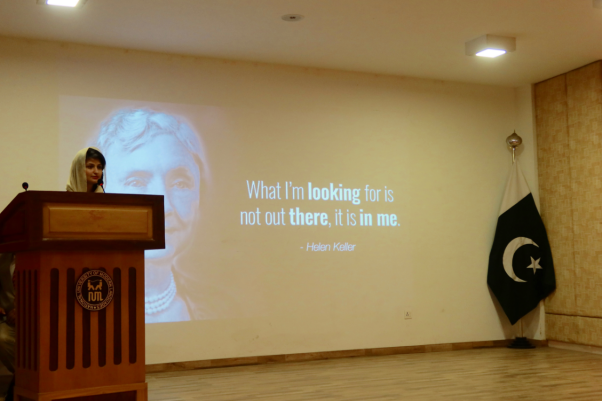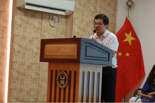 伊斯兰堡孔子学院中方院长、巴基斯坦国立现代语言大学区域研究系系主任张道建先生,以及“特殊群体之声”的创始人纳比尔沙蒂先生作为主要嘉宾出席了本次活动。纳比尔先生本人也是一位盲人,在讲话中他分享到“我们不把视障视作一个障碍,相反,我们不是用眼睛而是用心在与人交往,我们也感恩社会,因为大多数的人也是以同样的方式来与我们交往”。他积极乐观的态度以及对生活的感恩与热爱让现场观众受益匪浅。张道建院长在讲话中表达了对组织本次活动的老师和同学们的感谢与鼓励,并分享了自己当年读《假如给我三天光明》这本书的感悟,表达了自己对视障,残障以及所有特殊群体的敬佩,他对在场的盲人嘉宾以及学生说道:“你们并不是与我们不同的人,而是有能力让这个世界变得不同的人。”