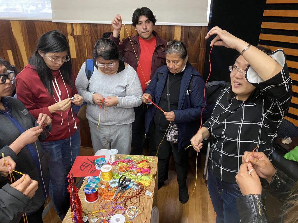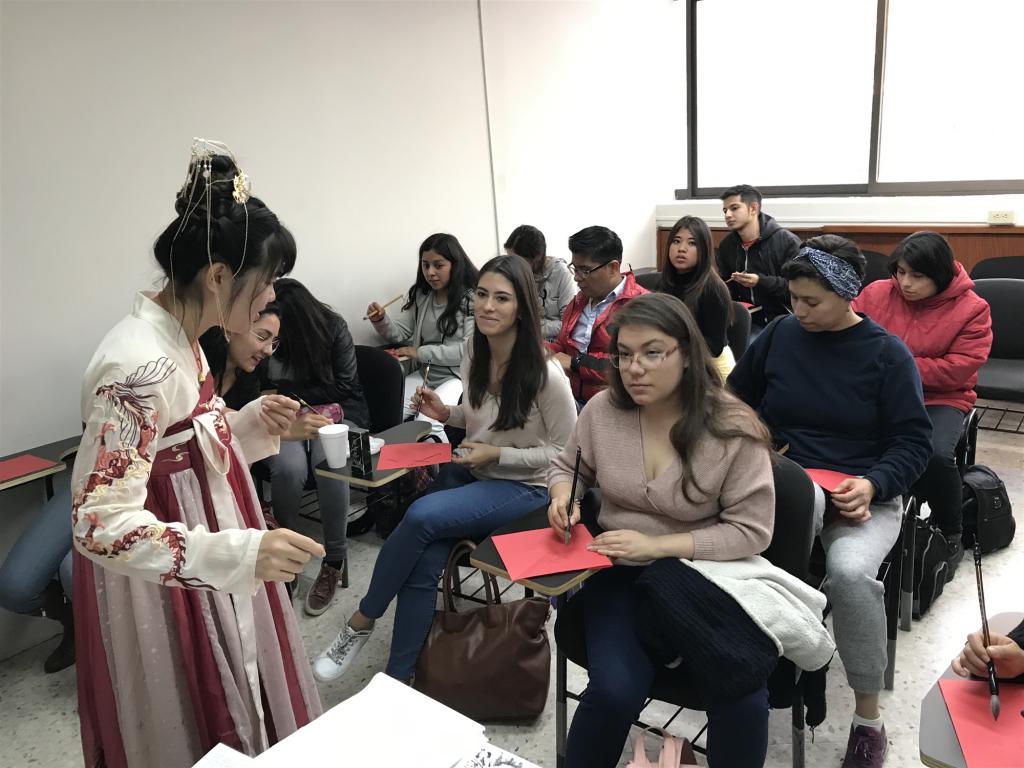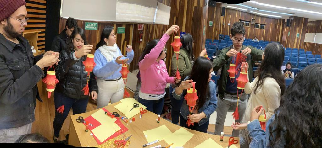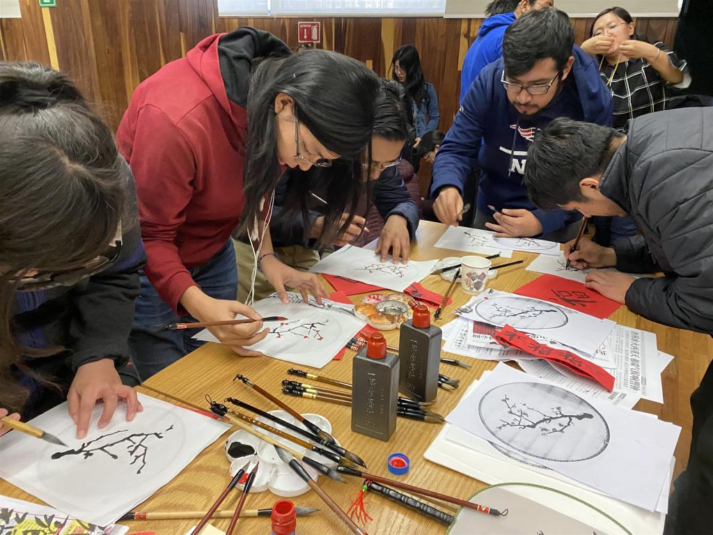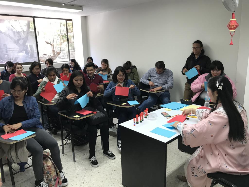 1月30日上午11点,墨西哥国立自治大学ENALLT学院也开展了新春庆祝活动,墨国大孔院应邀参与。孔院外方院长珍妮介绍了中国新年,墨国大ENALLT学院的汉语负责人里卡多则向学生们提问新春知识。此后,李智宇老师带领学生们编中国结,胡玲芳老师教学生画腊梅,张瑞老师则亲手教学生做灯笼。借此机会,墨国大孔院向前来参加活动的人群介绍了中国春节的习俗与文化,让他们有机会近距离接触中国文化,也增强了他们学习汉语的兴趣与动力。