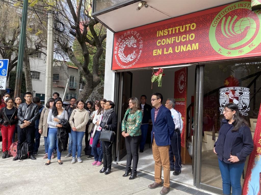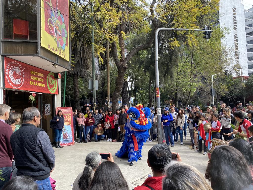 1月26日,墨西哥国立自治大学孔子学院(以下简称“墨国大孔院”)的中国农历新年庆祝在锣鼓喧天的舞狮表演中拉开了序幕。一红一蓝两只狮子随着鼓点起舞腾跃,吸引了众多路人驻足观看,为他们精彩的表演鼓掌喝彩。