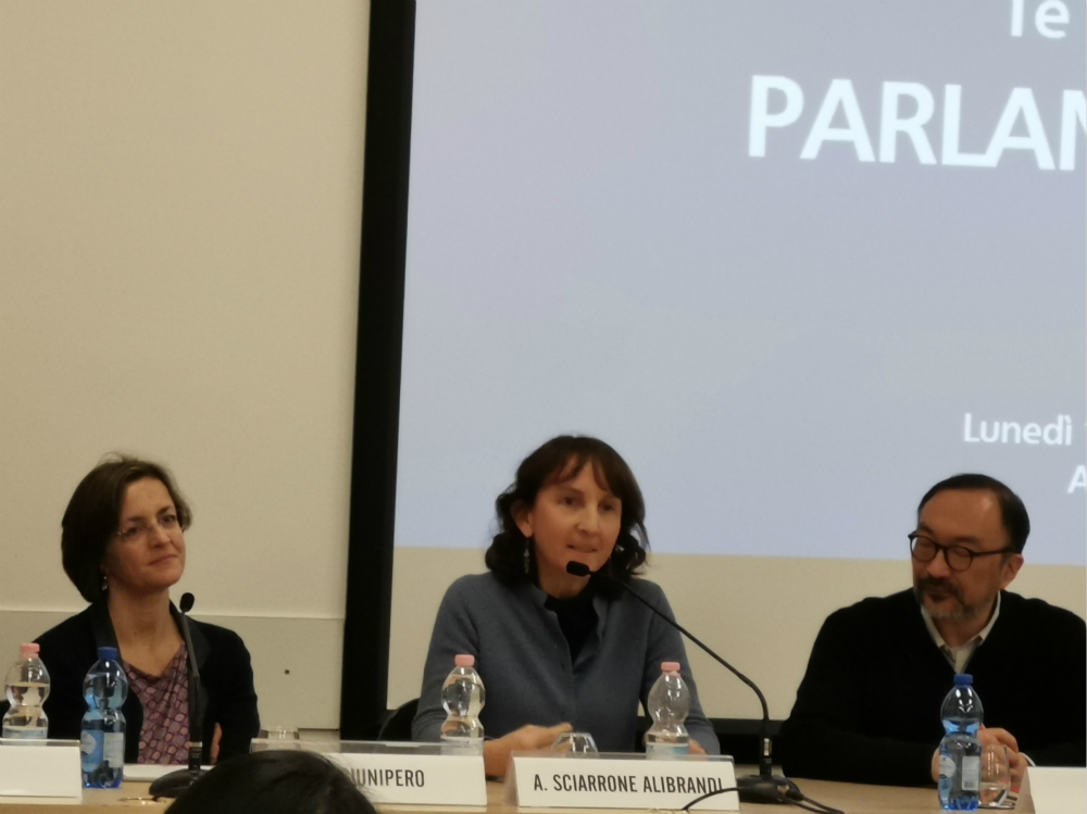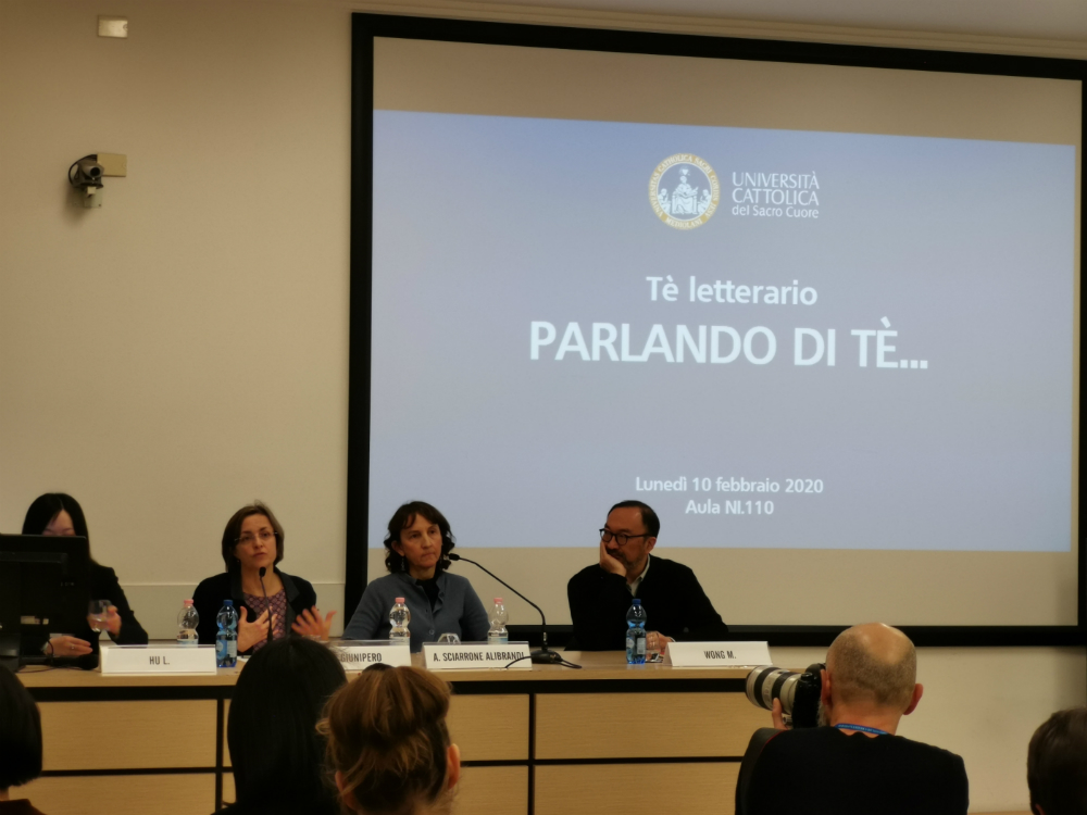 讲座伊始,首先由圣心大学第一常务副校长安托内拉(Antonella Sciarrone Alibrandi)女士发表致辞。她针对消除意大利对华疫情偏见发表了自己的意见。她谈到:我们都知道,前几天是中国的元宵节,元宵节是一连串新春庆典的终结,在此新冠状病毒带来普遍忧虑的困难时刻,天主教圣心大学对中国人民表达深切的关注与支持。本大学拥有的普世观念是各尽所能并以维护全人类健康为首务,因此我们对所有因疫情发展情况报道而出现的反华偏见提出谴责。本校教职人士在此特别对所有中国留学生、意籍华裔学生、各位学生的家人亲友,以及目前生活在中国,留学或工作的本校中国及意大利学生表达最深切的关注。我深信各个国家民族互相合作的重要性,同时我也深信我们一定能通过认知和学术上的交流切磋,找到能抗拒无知和种族歧视的最有效解药。我校一直以来都不遗余力地在意大利本土推广中国语言文化,就是希望可以为建设一个更少冲突撕裂,更多和平相处的世界而作出贡献。因此今天让我们一起在这里支持武汉,对恐惧中国说不!