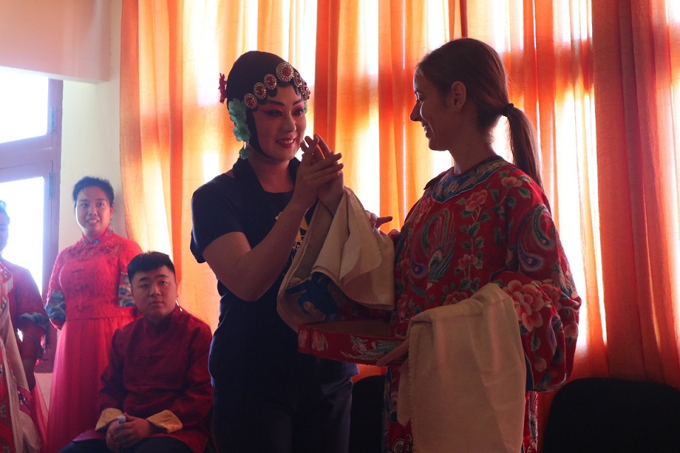 在交流互动环节,京剧老师亲自指导,孔院学生穿上戏服,甩袖、开嗓、走位,生动地展现了京剧的风采。