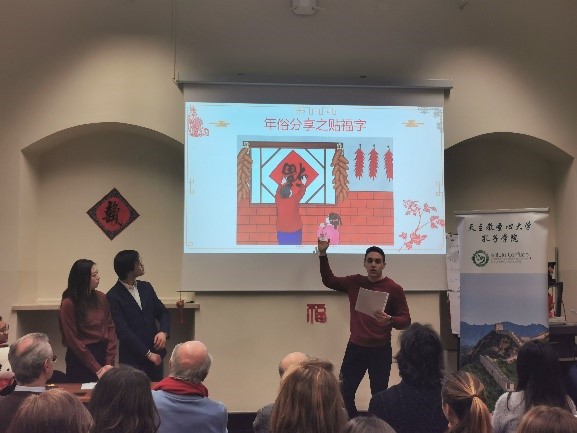 马良(Mirko Marotta)为大家介绍了年的由来,人们敲锣打鼓放鞭炮吓跑年兽的故事让大家对年有了不一样的认识;乔维枫(Federico Dalla Vecchia Ciofi Degli Atti)普及了窗花的知识,他介绍道蝙蝠因为音同“福”,所以中国人把这个稍显邪恶的小东西剪成窗花贴到窗上;罗文娜(Alisse Arianna Rodriguez Valenza)介绍了中国人贴年画的风俗:贴门神以保佑家宅平安,画娃娃以期盼人丁兴旺;艾马(Emanuele Alfonso Zambelloni)介绍了贴福字的讲究,他活泼生动地介绍引得大家笑声连连;最后,朱亚力(Giovanni Antonino Zagra)介绍了饺子的故事。