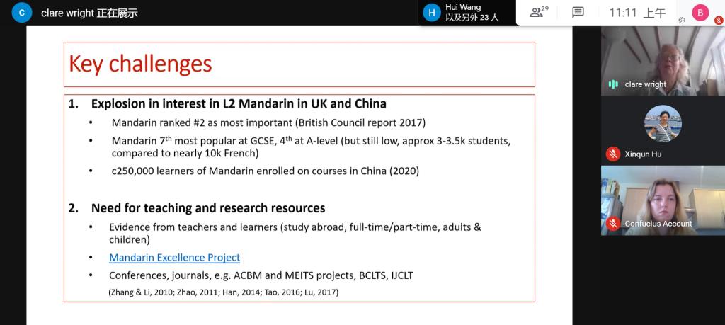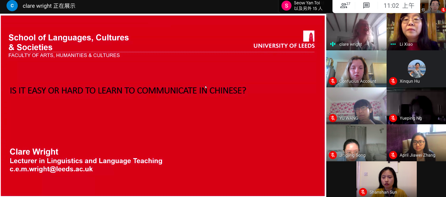 当地时间7月2号,英国谢菲尔德大学孔子学院,邀请利兹大学语言学与语言教学教授克莱尔·莱特(Clare Wright)博士以“学习汉语易或难”为题,探讨中文教学所面临挑战及逐步发展的汉语教学实践,来自谢大孔院、利兹大学和阿根廷首都布宜诺斯艾利斯三十多名汉语教师和汉语学习者参加了线上讲座。