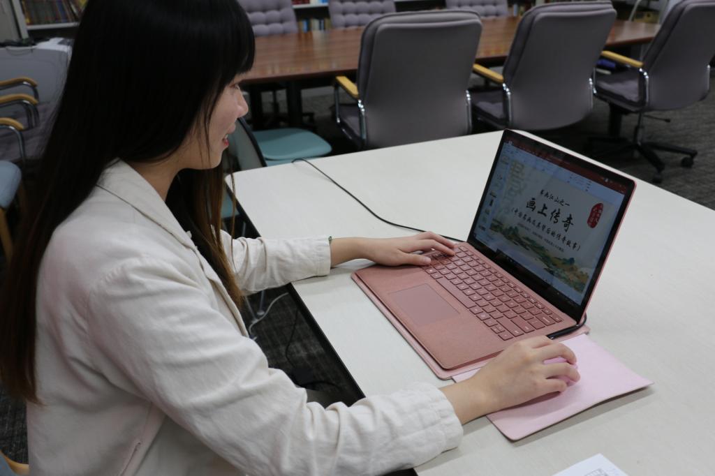 主讲老师以问题为导向,引导大家带着问题去观察画中的世界,描述自己的所观所感。通过视频欣赏了《千里江山图》全卷,大家不禁沉迷于气势磅礴的画作之中,折服于画作的艺术魅力,并在观看视频后各抒己见。接着,为帮助大家进一步领略名画背后的历史、创作背景和文化内涵,老师带领大家观看了《国家宝藏之千里江山图》视频,将图卷的“前世今生”生动形象地展示在大家眼前。不止于此,老师还进一步向大家介绍了以《千里江山图》为灵感来源的中国风游戏《绘真妙笔千山》、流行歌曲《千里江山》、服装设计、书籍等,向大家展现出了中国传世名画的生命活力。