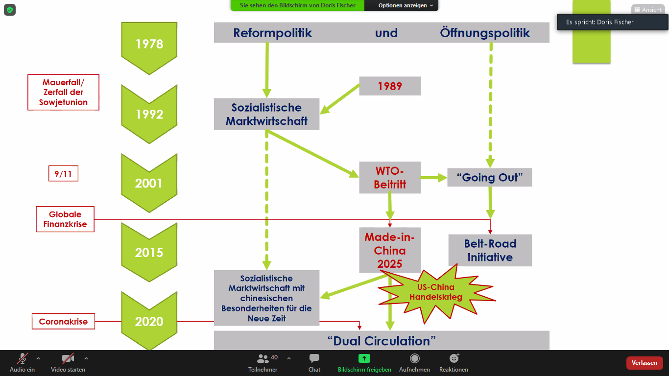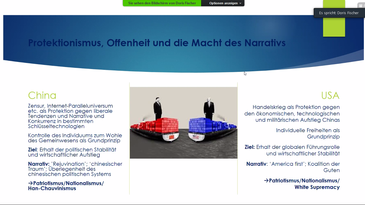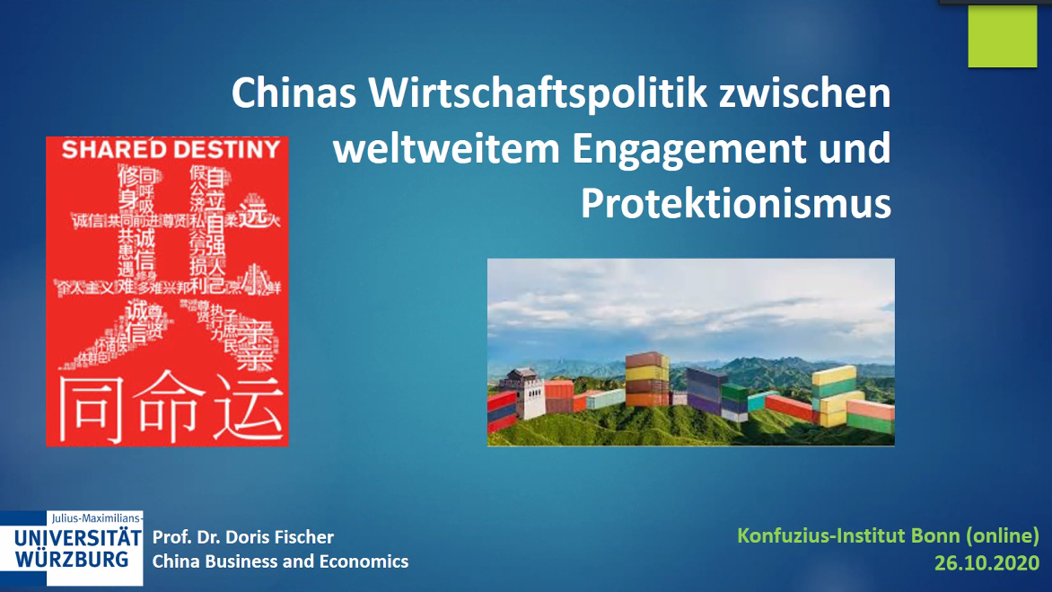 10月26日,波恩大学孔子学院成功举办了“全球参与和贸易保护主义之间的中国经济政策”在线研讨会。维尔茨堡大学中国贸易与经济学教授多里斯·菲舍尔(Doris Fischer)担任此次研讨会的主讲人。波恩孔子学院德方院长杨梅妍博士(Dr. Katja Yang)主持会议。该研讨会共有40余人参与。