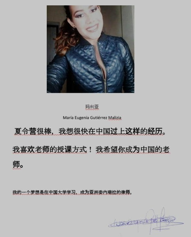 桑黛山同学是本次开营仪式中的学生代表,同时她也是委内瑞拉玻利瓦尔大学孔子学院HSK五级班的学生。桑黛山同学对中文学习有着很高的热情和极大的兴趣。开营仪式上,她用流利的中文和同学们分享了自己学习中文的经验,认为多和老师交流、掌握适合自己的学习方法、不断地操练是学好中文的关键。她表示自己要在本次夏令营中继续努力,和同学们一起加油进步!