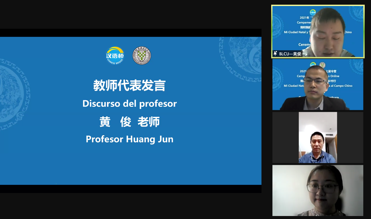 黄俊老师作为本次夏令营教师代表发言。他表示,疫情期间同学们学习中文的热情、对中国文化的热爱,并没有因为客观条件的制约而有所减退,反而比过去更加强烈。他和夏令营的全体教师团队共同精心准备了线上夏令营课程及活动,为同学们搭建这样一个既可以学习中文、又能够了解中国文化的平台。黄俊老师鼓励学生们在课堂上积极参与,下课后认真完成作业,在有限的时间里,学到更多的中国语言文化知识。