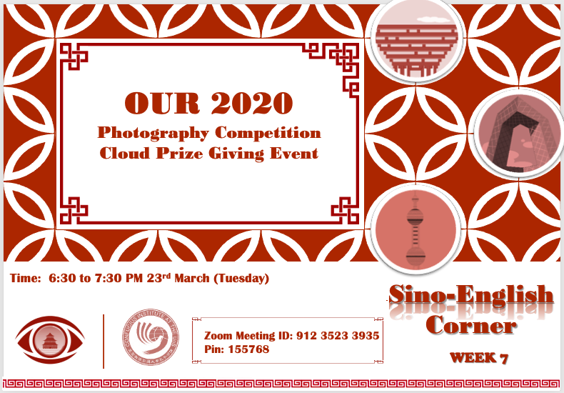 当地时间3月23日晚,谢大孔院汉英角第七周特别活动之“我们的2020”摄影大赛云端颁奖典礼在ZOOM平台如期举行。