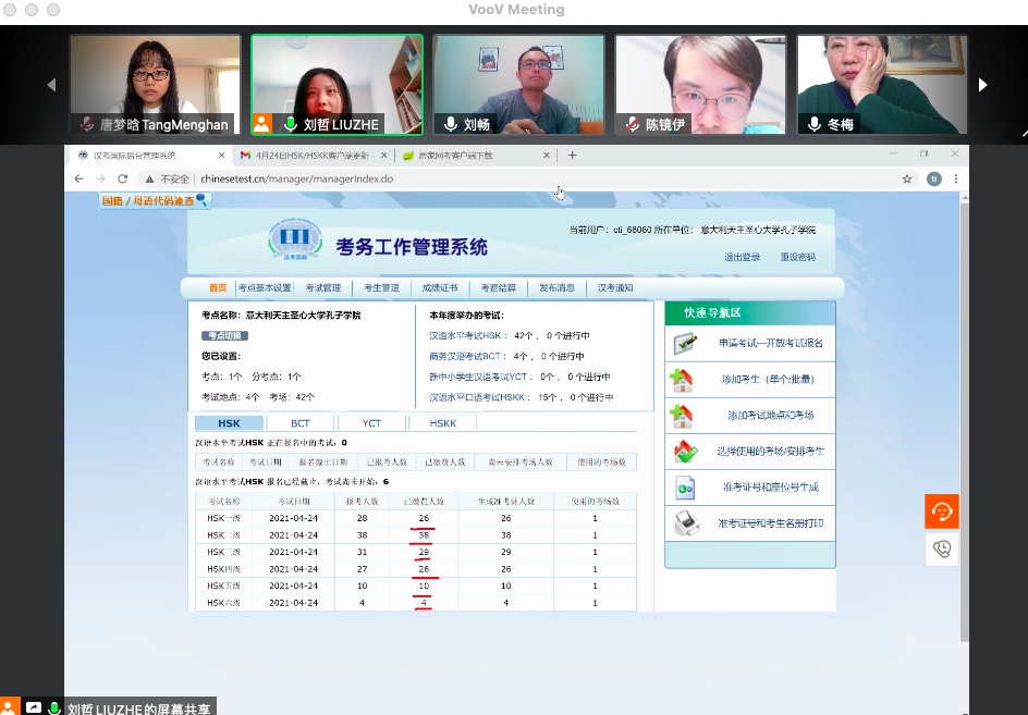 考前,圣心孔院制定了详细的考务工作方案,于4月19日召开线上考务会议。主监考老师刘哲向大家介绍了本次考试的新规定,并再次强调考试纪律。此外,我院也于4月21日对考生进行在线答疑,安排考生进行考前模拟,确认设备及考试环境,保障了考试的顺利进行。