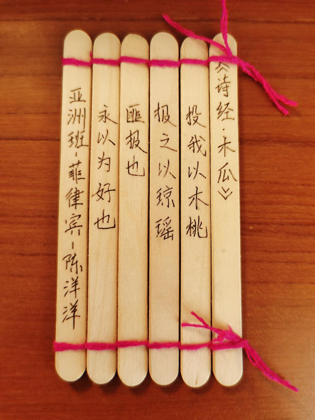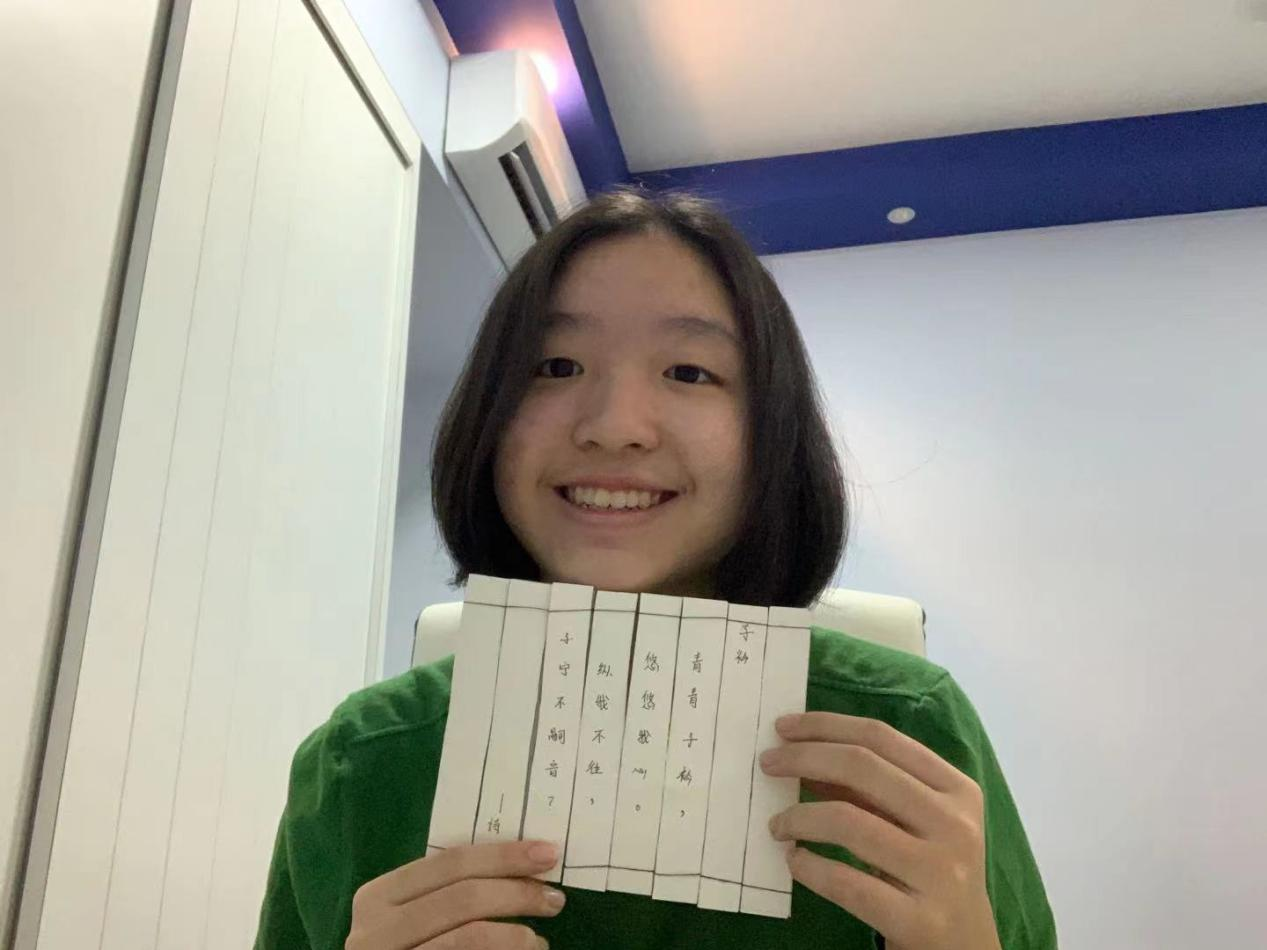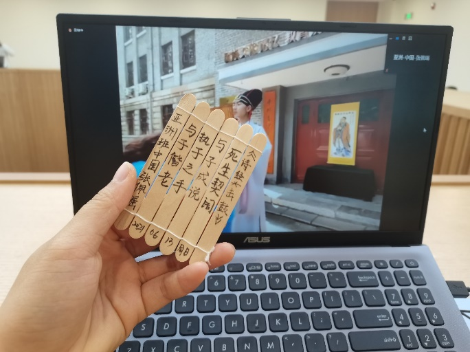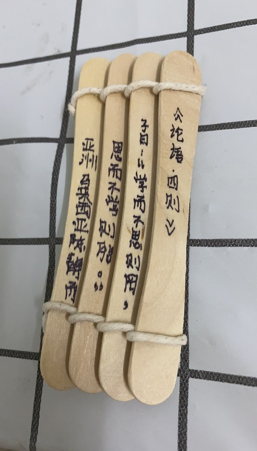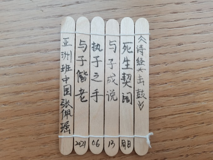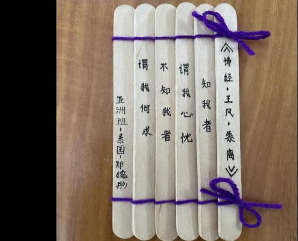 除了在云端体验礼仪展演活动之外,学员们还跟着北京语言大学的直播课老师们一起动手,使用身边的材料冰淇淋棍及绳子学习制作竹简,再将喜欢的《诗经》《论语》句子写上。