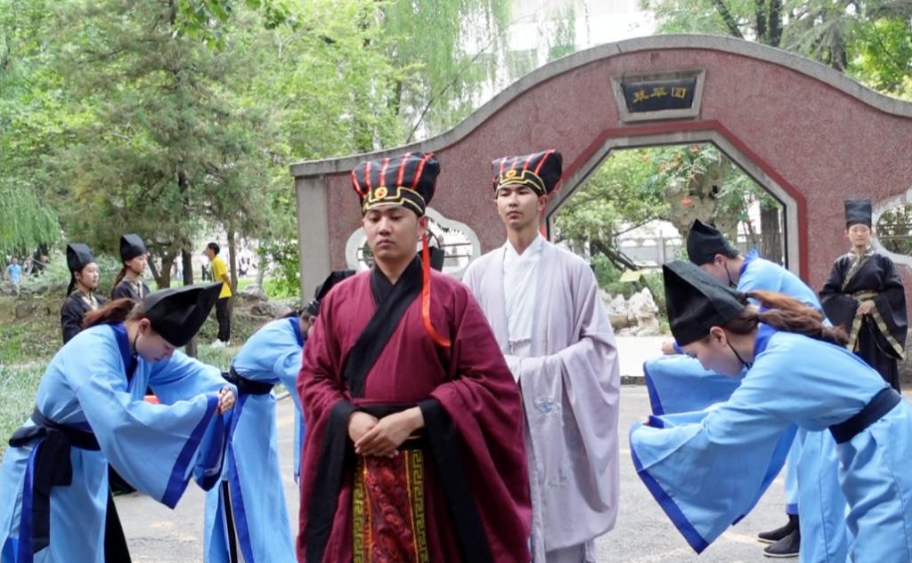 在直播中国云体验课程中,曲阜师范大学历史文化学院传统礼仪研修中心大学生礼仪队的队员们身着汉服、头戴儒冠,为全球学员献上了一场精彩的“束脩礼”展演。俗语云:“生我者父母,教我者师傅”,该礼仪展演以“尊师重道,明礼求学”为主题,再现了正衣冠、诵读《束脩告文》、献戒、执束脩、训诫、礼敬师儒等场景。观看完毕后,历史文化学院院长成积春教授、指导教师骆明老师还与线上参加直播学习的中外学员进行了互动,对学员们提出的问题进行了详细而深刻的解答。