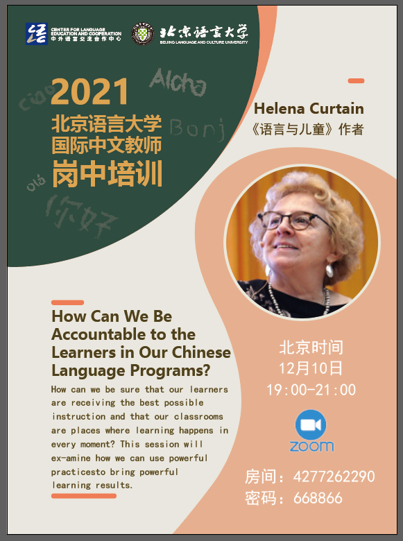 12月10日,在北京语言大学孔子学院教师培训中心组织的国际中文教师岗中培训中,美国著名语言教育专家海伦娜•柯顿(Helena Curtain)用“I am changing the world, one learner at a time.”(我正在改变世界,哪怕一次影响一名学习者)激励屏幕前听讲座的老师们。海伦娜•柯顿教授是美国密尔沃基公立学校的外语课程专家,长期从事K-12外语教学和ESOL项目(母语非英语者的英语项目)的协调和管理工作,指导ESOL教师的岗前培训,曾公开发表多篇关于教学指导的文章,并获得过美国国家和州政府奖,是享有国际声誉的语言教育专家。