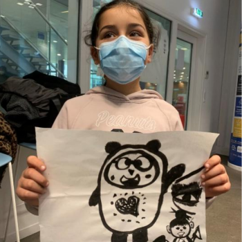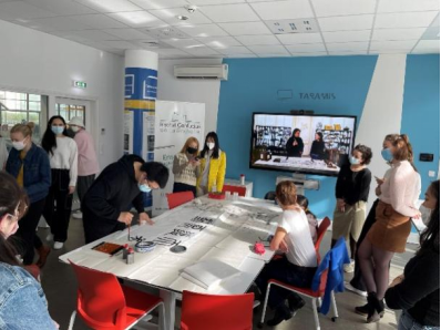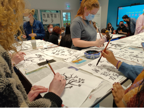 在大学图书馆举办的中国书法活动也是孔院文化周的一部分。书法爱好者、中国留学生邵任翔同学首先给大家展示了小篆和楷书,并且手把手地教大家握笔和书写,然后由孔院志愿者老师们一对一地进行辅导。除了大学学生之外,许多市民和儿童也慕名而来。一个叫米娅的10岁小姑娘还让志愿者老师教她画“冰墩墩”,因为正在收看法国电视台北京冬奥会比赛转播,她非常喜欢这个冬奥会吉祥物。