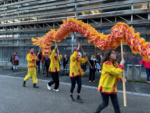 14日傍晚,伴着喜气洋洋的鼓点,一条色彩艳丽的中国龙在拉罗谢尔大学校园盘旋舞动,中法学生的舞龙表演为中国新年文化周拉开了序幕。中国龙神采奕奕,灵动活泼,穿行于大学校园,吸引着众人驻足观看。舞龙教练Samiel先生是大学工作人员,听说中国龙要在校园飞舞,就自告奋勇地担起了队长兼教练的工作,并和孔院一起找道具,组织学生排练,在大学校园引起了不小的反响。
